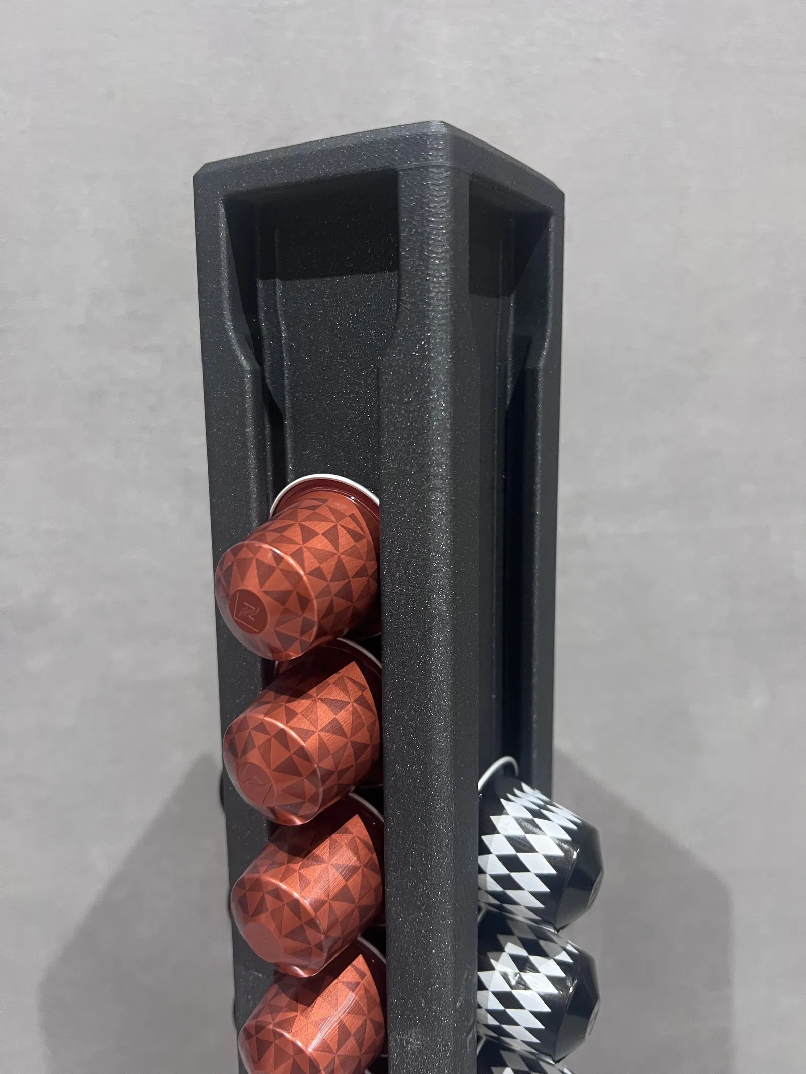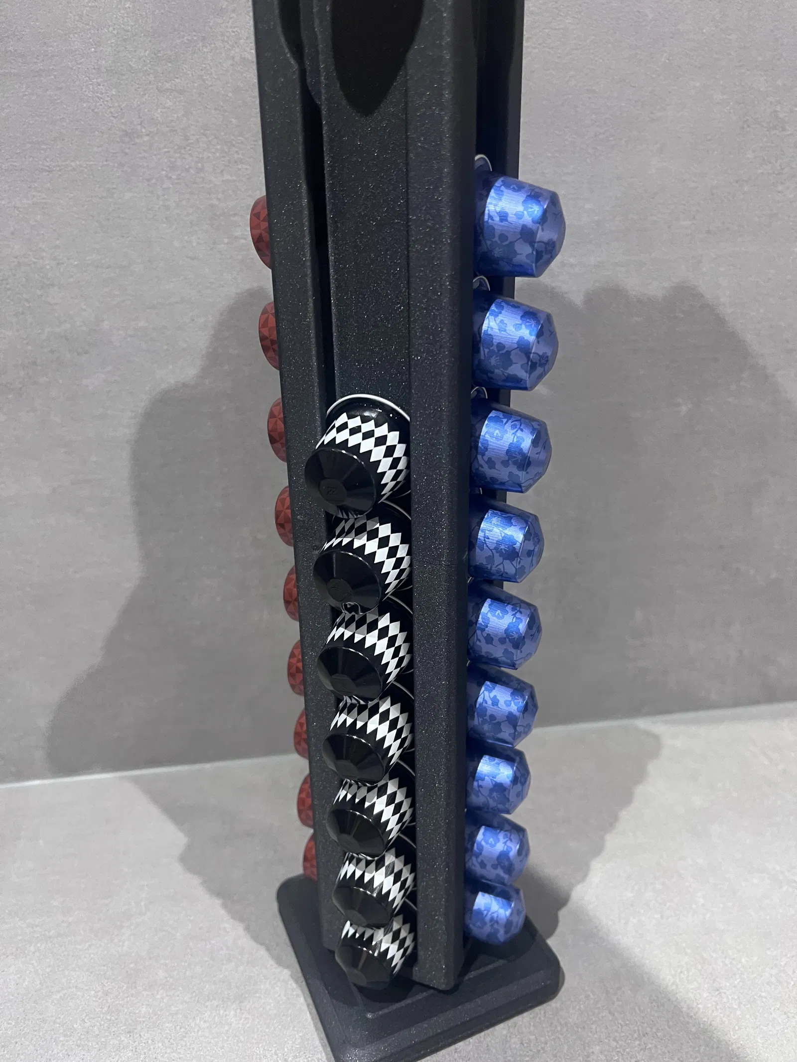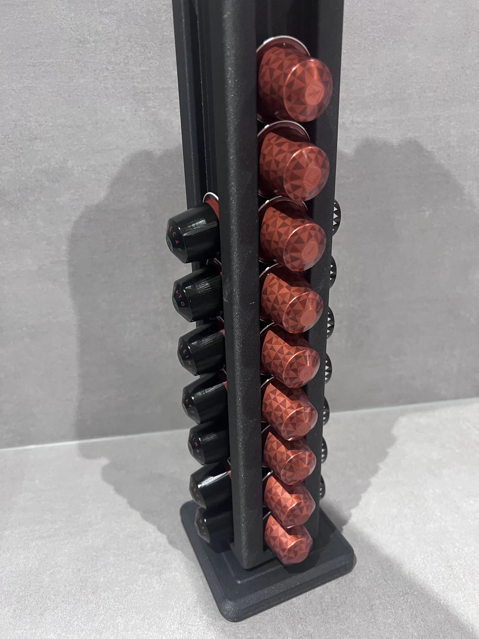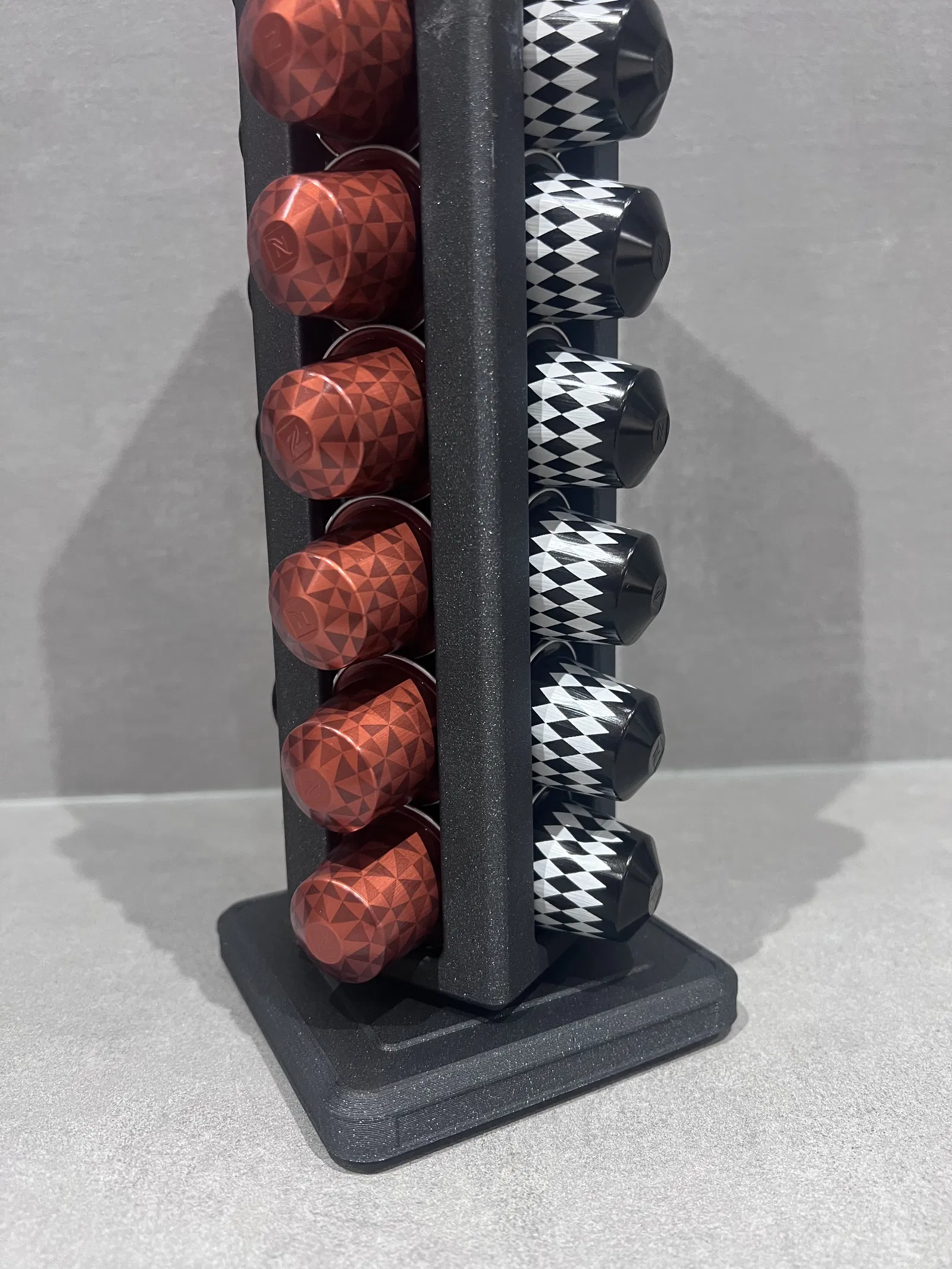Giá đựng capsule Nespresso dạng carousel xoay, chứa 40 pods (4 cột x 10). Bản V3 tăng độ ổn định và độ bền, xoay mượt hơn, có bu-lông khóa để nhấc lên di chuyển dễ. In 4 phần, không cần supports.
