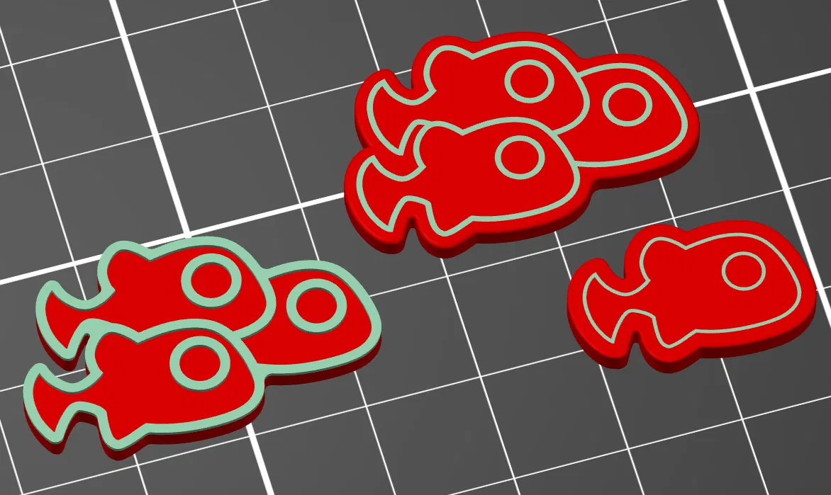 Về kích thước thì tuỳ bạn muốn nó to cỡ nào trên board. Mình đã dựng model và canh size theo tỉ lệ từ hình, nên lúc in mình chắc sẽ scale X và Y lên 130% để ra đúng cỡ như thẻ. Không thì nhất là mấy con cá đơn sẽ hơi nhỏ.