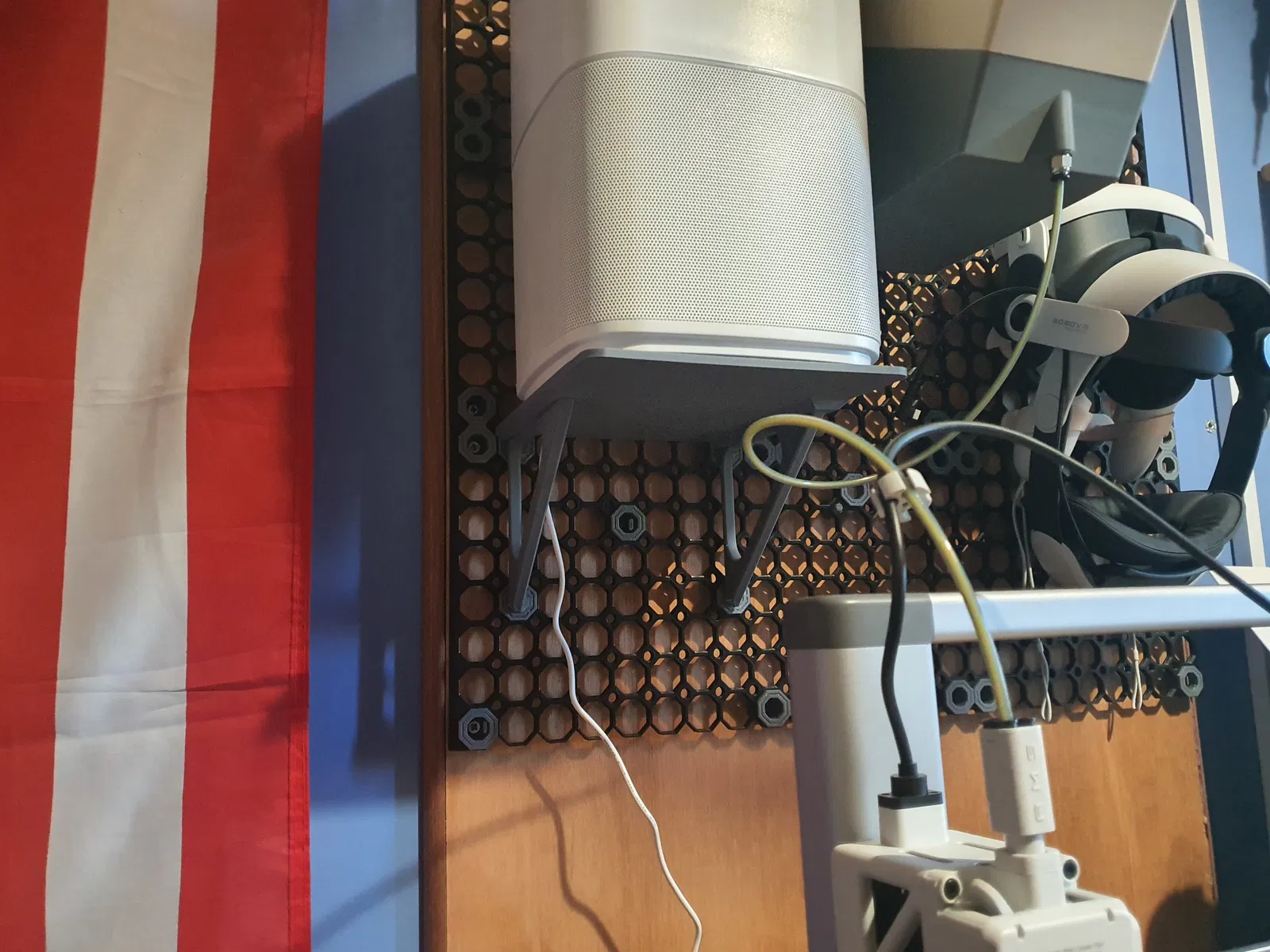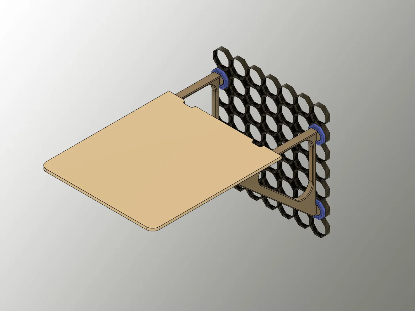 Phần đáy kệ dạng phẳng (Shelf Flat base) được thiết kế để trượt vào rãnh (rails) của tay đỡ, nên khi cần bạn có thể tháo ra bất cứ lúc nào và đổi sang cái khác. Mình cũng làm 2 lỗ đi dây ở phía dưới của phần Base, phòng trường hợp bạn dùng cho thiết bị điện giống mình (máy lọc không khí).
