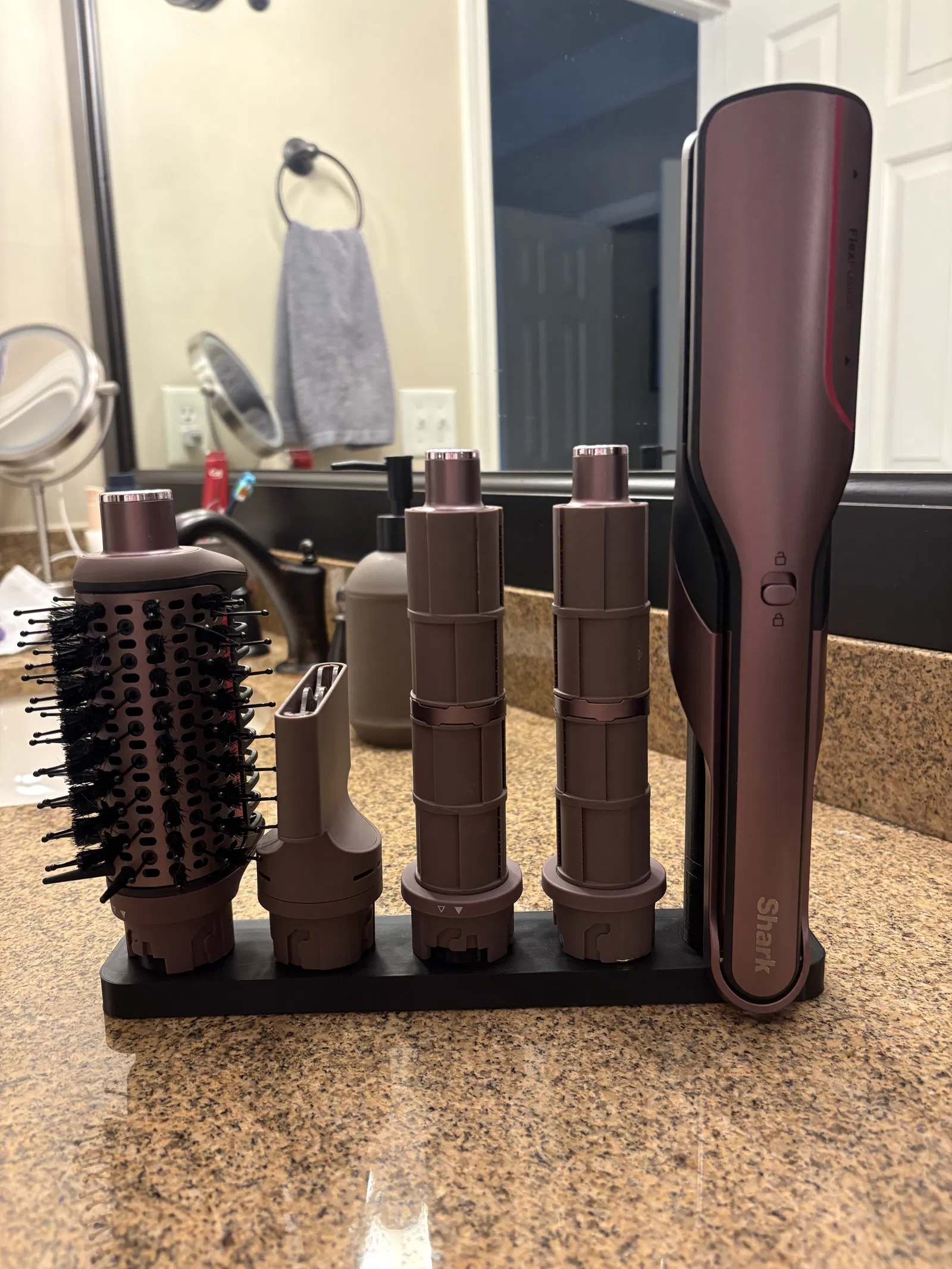 Giá đỡ cho các đầu phụ kiện đi kèm Shark FlexFusion Air and Ceramic Styling System: brush, styling concentrator, 2 curler và wet/dry fusion air straightener. Đã dời chỗ giữ brush ra xa để lông không chạm.