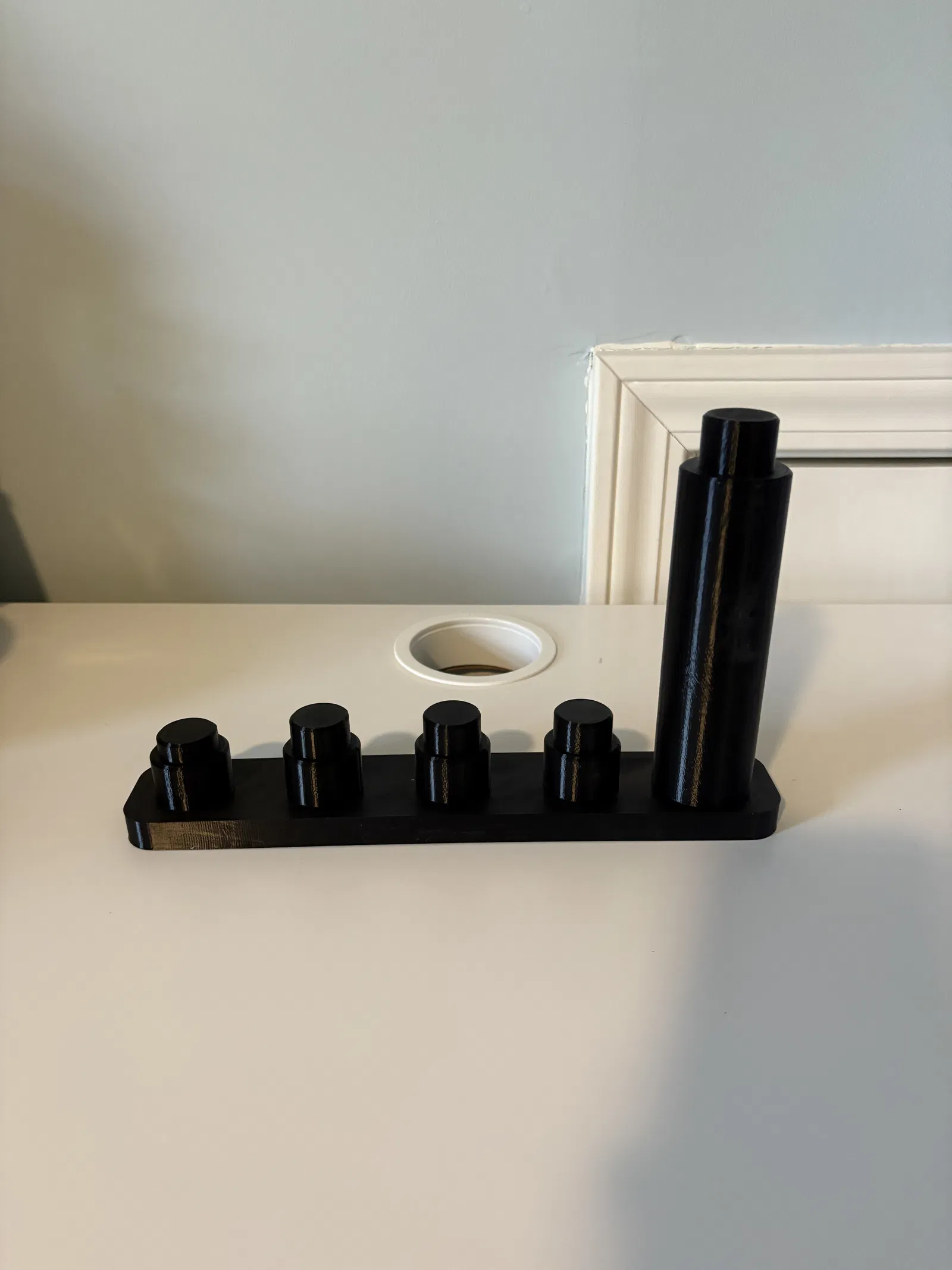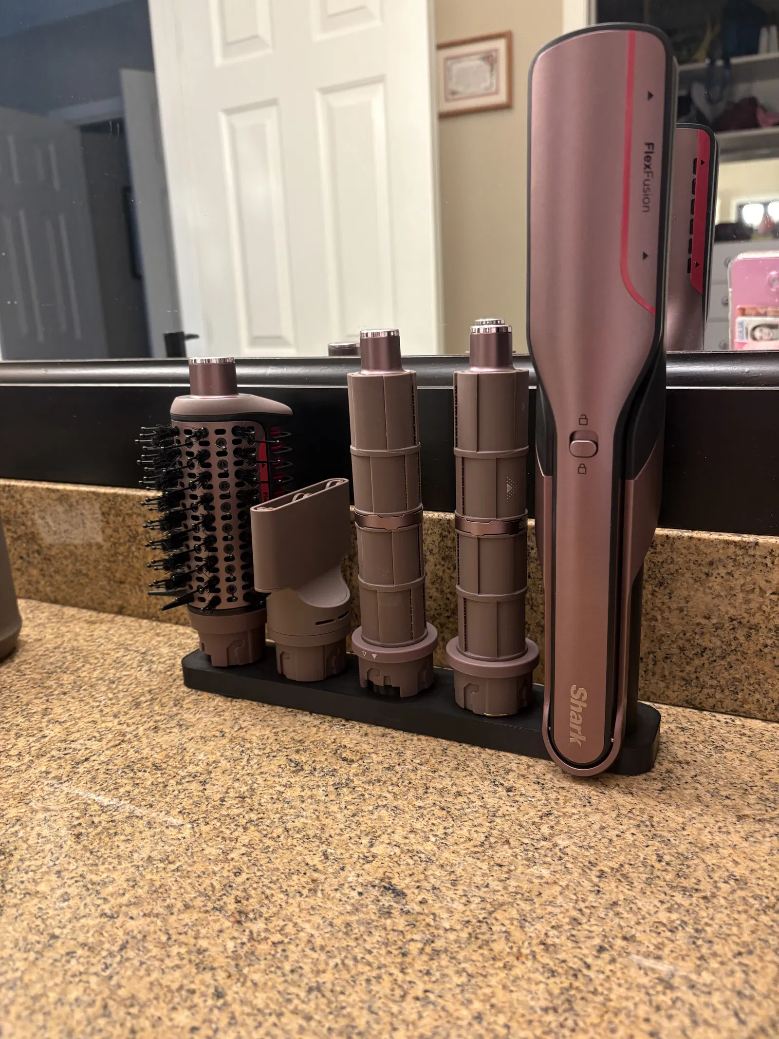 Mẫu này dùng để giữ/gắn gọn toàn bộ các đầu phụ kiện đi kèm bộ Shark FlexFusion Air and Ceramic Styling System. Nó có chỗ để brush, styling concentrator, 2 đầu curler, và đầu wet or dry fusion air straightener. Mình đã chỉnh lại thiết kế so với mẫu trong hình: phần giữ brush được dời ra xa các phần còn lại một chút để lông brush không bị chạm vào. Nếu có vấn đề gì với mẫu thì cứ để lại comment giúp mình nha!