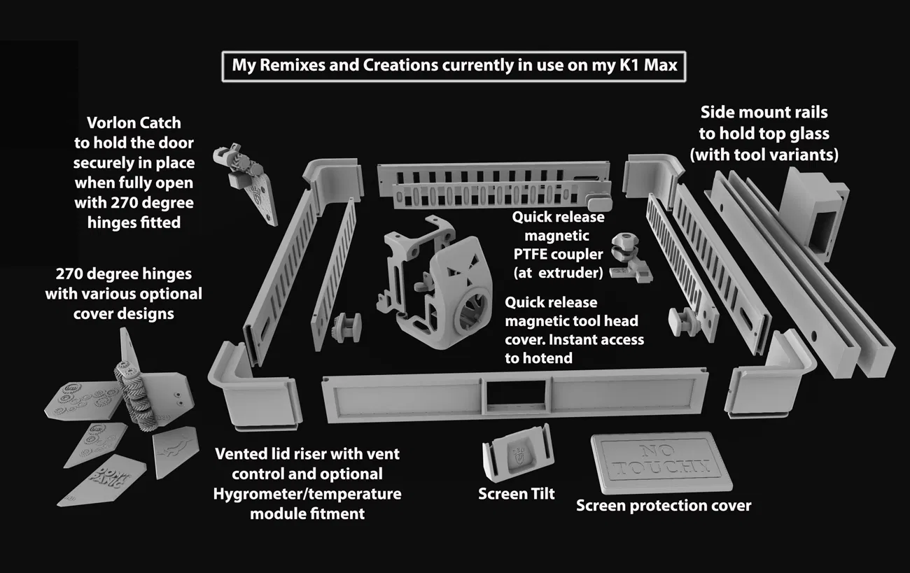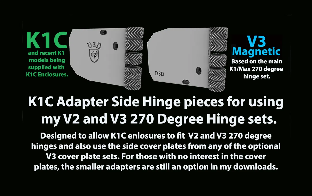 Đây là một bộ adapter plates thay thế, cho phép K1C (và K1 đời sau với enclosure kiểu K1C mới) dùng được bộ bản lề K1/K1 Max 270 độ V2 và V3 của mình, đồng thời cũng dùng được side covers V3 trên các adapter mới này.