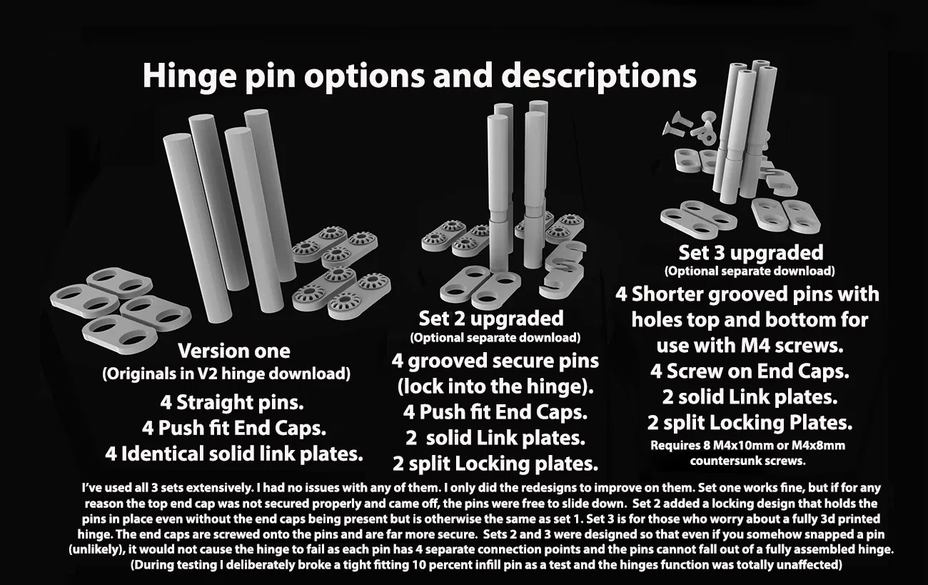 Vì 2 phần này được làm dựa trên miếng side hinge của V3 và có sẵn lỗ (apertures) cho nam châm, bạn có thể gắn bất kỳ side pieces V3 nào lên hai phần này. Version 1 trước đây chỉ có một cặp plate và chỉ dành cho phần trước của bản lề. Version 2 (loại bắt vít) có nhiều bộ hoàn chỉnh cho cả 4 phần bản lề V2. Version 3 cũng có nhiều bộ cover hoàn chỉnh cho tất cả các phần V3.