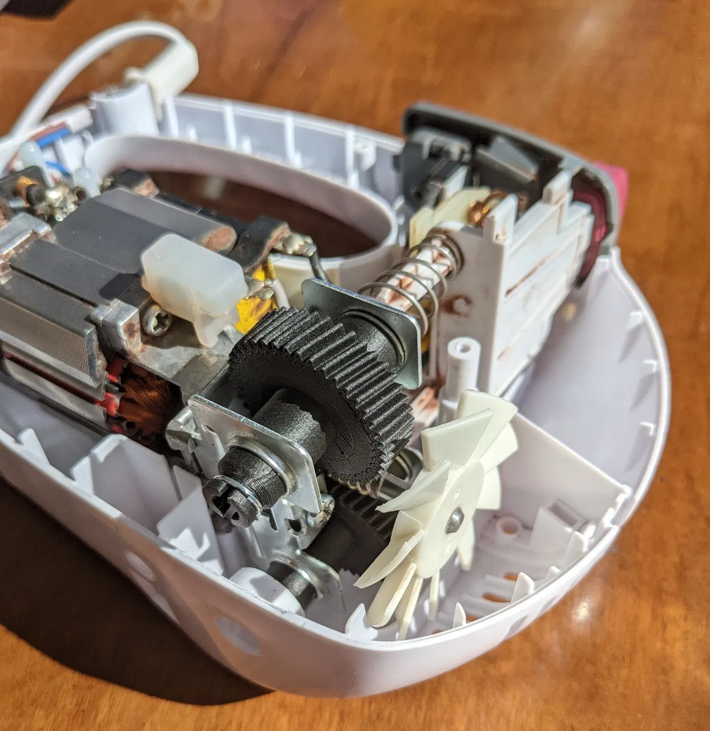 Máy đánh trứng / mixer này dùng cơ cấu worm drive và hai bánh răng nhựa để truyền động cho các que (bits) trộn đồ ăn. Đây là bản thay thế cho mấy chi tiết nhựa đó vì chúng rất dễ bị mòn. Mình in đồ thay thế bằng eSun ePA-CF, độ bền thì chắc là dư xài, nhưng có thể sẽ làm tăng mòn cho worm gear (sợi carbon fibre rất mài mòn). Mà thôi, máy cũng hư sẵn rồi còn gì?