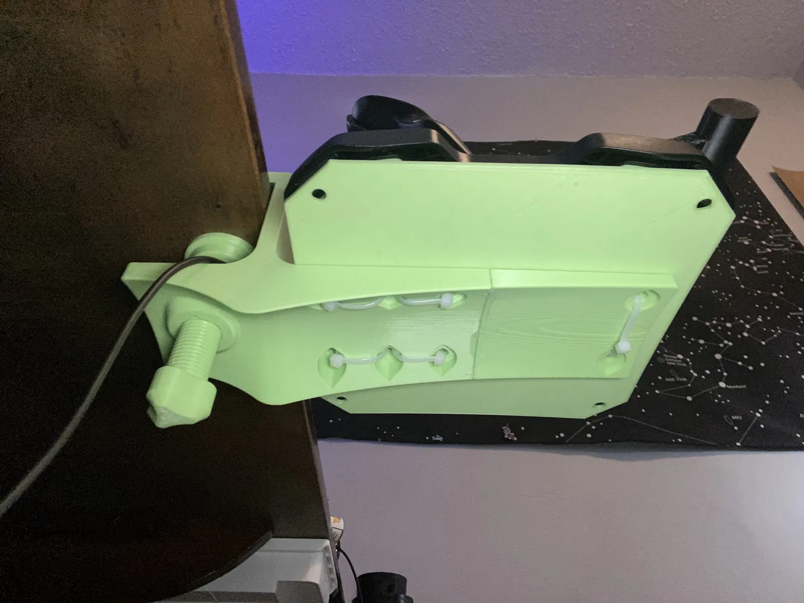 Cái mounting bracket bám rất chắc vào ThrustMaster desk clamp, nhất là khi mình dùng zip ties làm phần “hardware” để cố định.