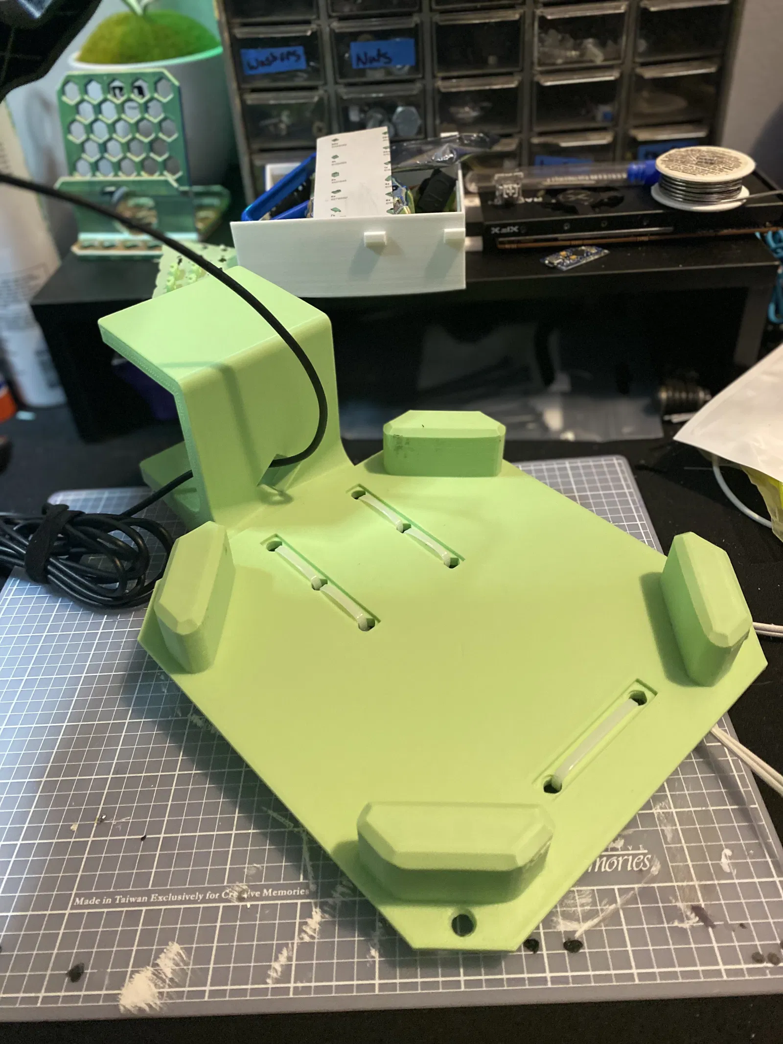 Vị trí lắp của V.2 chắc chắn hơn V.1 nhiều, nên mình khuyên in bản đó (nhìn cũng gọn hơn một chút vì không bị thò/overhang lên mấy cái cutouts hơi “kỳ” mà Logitech làm. Với lại cũng tốn ít filament hơn chút).