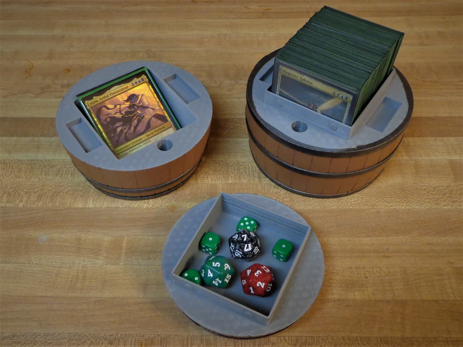 Phiên bản 2 của hộp đựng deck Barrel của mình. Bản mới này vẫn chứa được 100 lá bài MTG double sleeved và còn dư chỗ cho token. Hai bên hông có ngăn để 6 viên xúc xắc 12mm và để được bút bi hoặc bút chì dài tối đa 105mm. Bên dưới có thêm một ngăn mới để đựng thêm xúc xắc và các phụ kiện nhỏ khác, và nhìn vẫn y như một thùng rượu whiskey!
