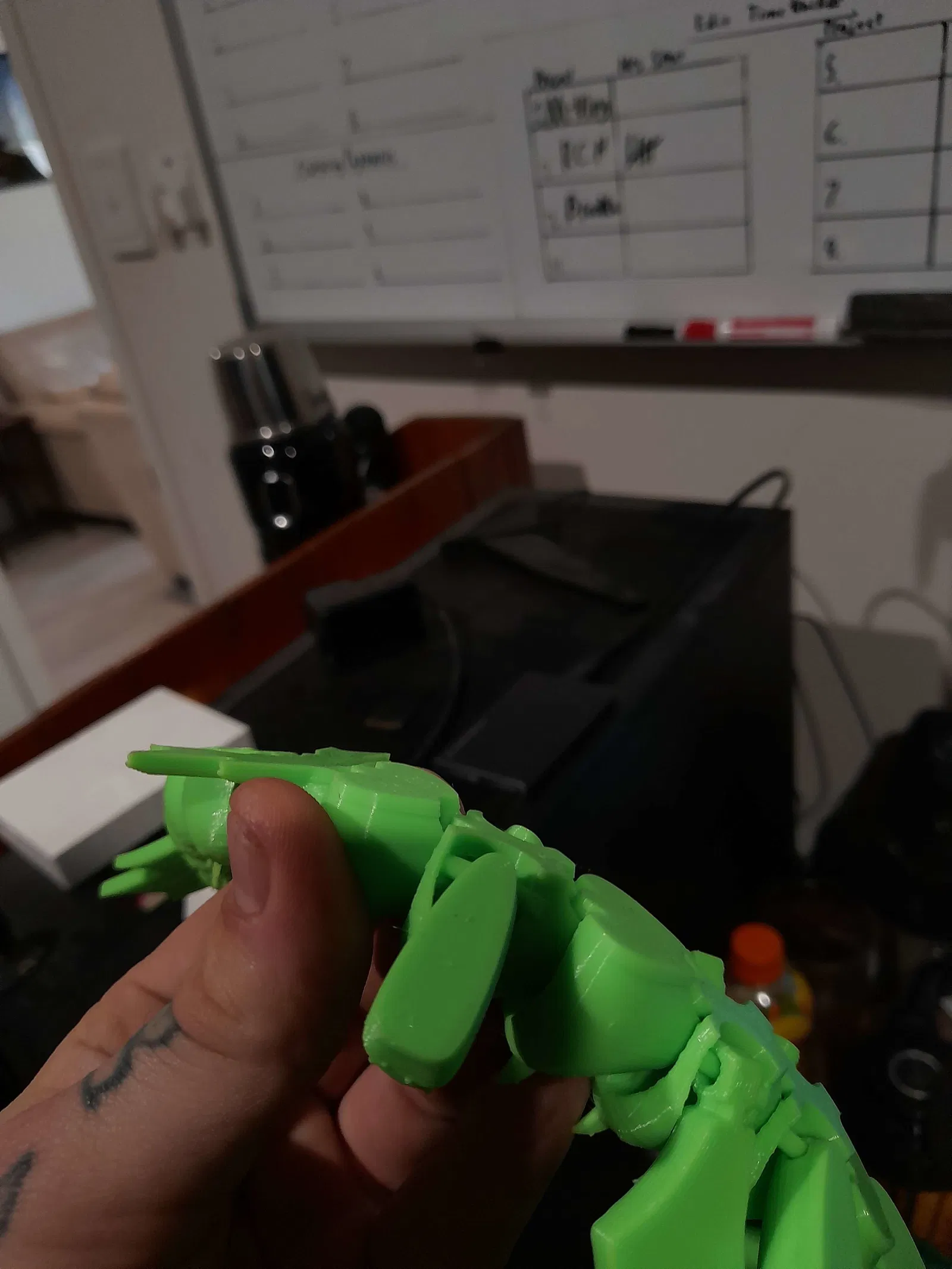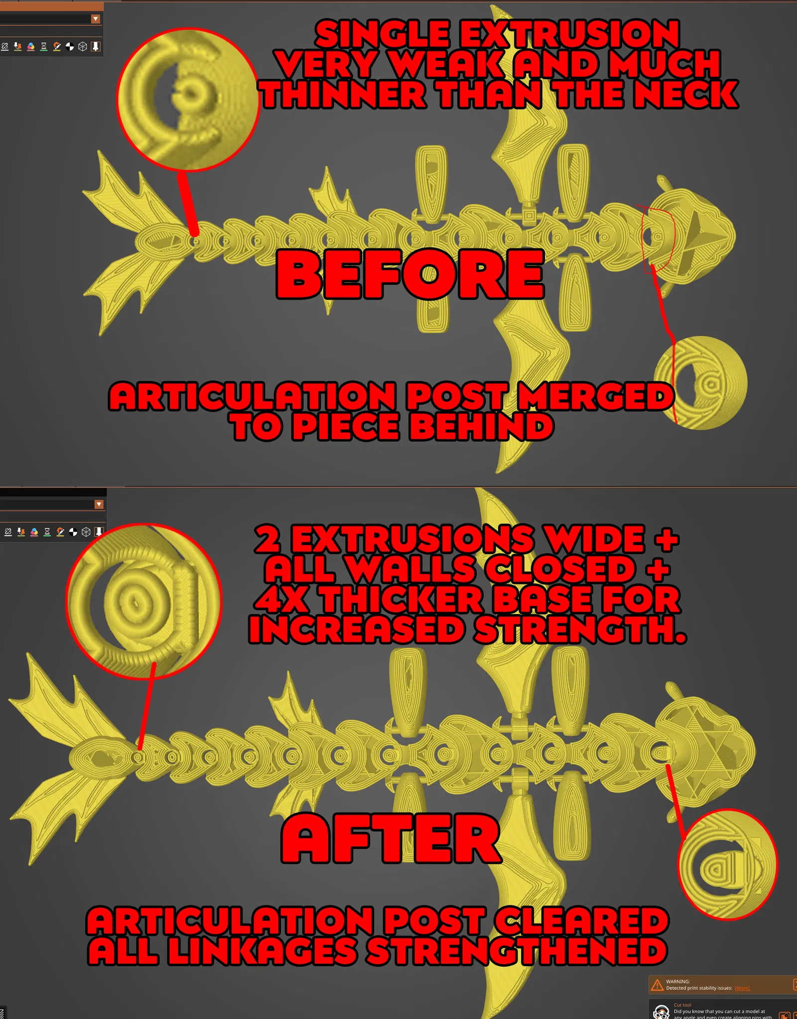 Bản remix của mình dùng negative volumes để loại bỏ phần articulating post bị dính (merged) và link wall cho các phần đầu và cổ; đồng thời mình dùng các phần cylinder được chỉnh kích thước riêng rồi merge vào model để tăng mỗi điểm khớp (articulating point) từ một extrusion 0.6mm lên tối thiểu 3 perimeters, với các phần nặng nhất của model thì có 4–5 perimeters.