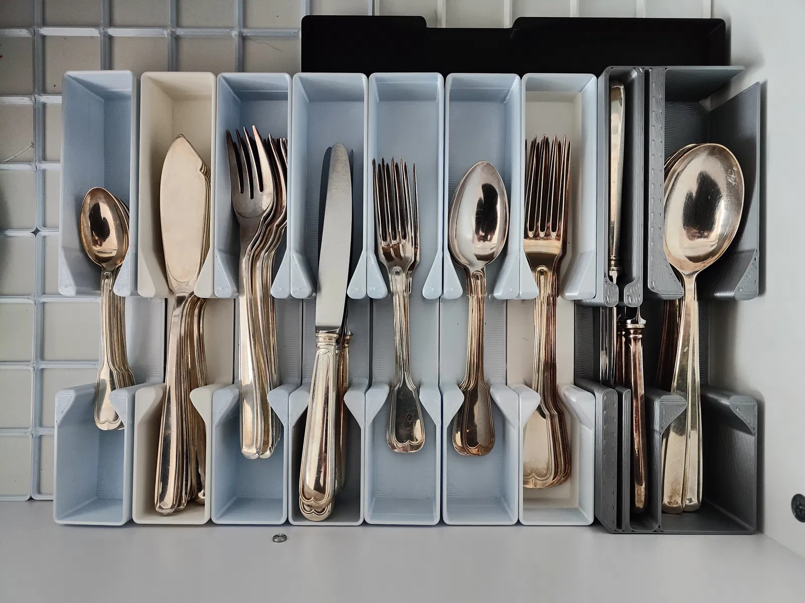 Mình muốn sắp xếp gọn gàng toàn bộ dao muỗng nĩa nhưng tìm hoài không thấy mẫu Gridfinity nào cho vụ này, nên mình tự làm thử.