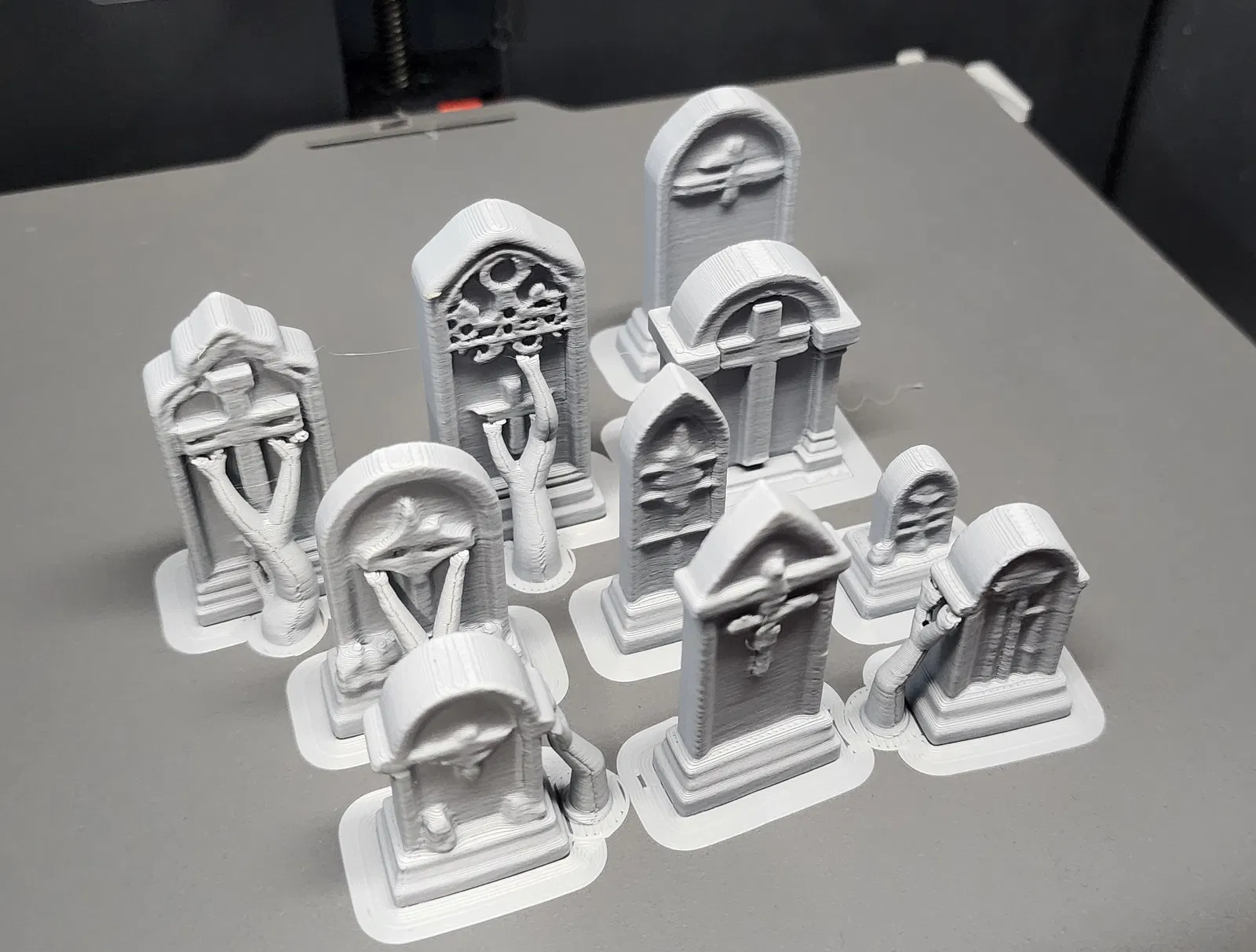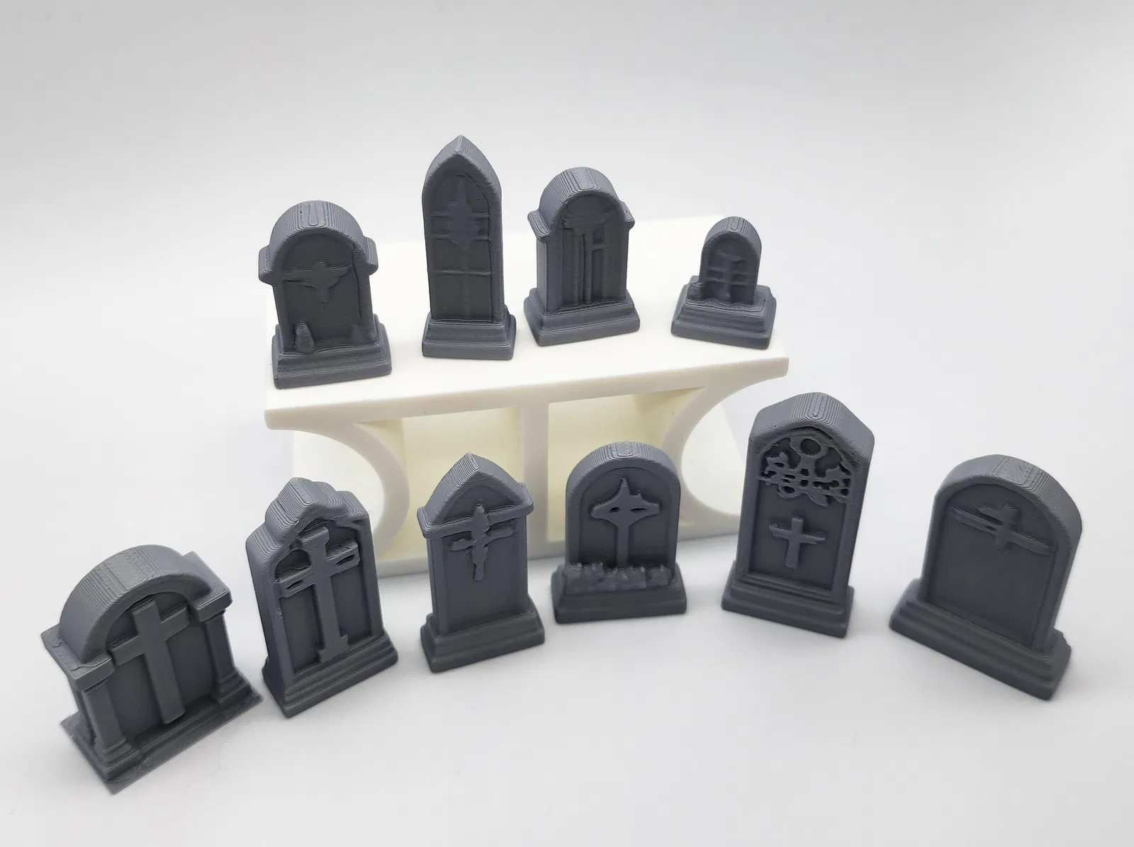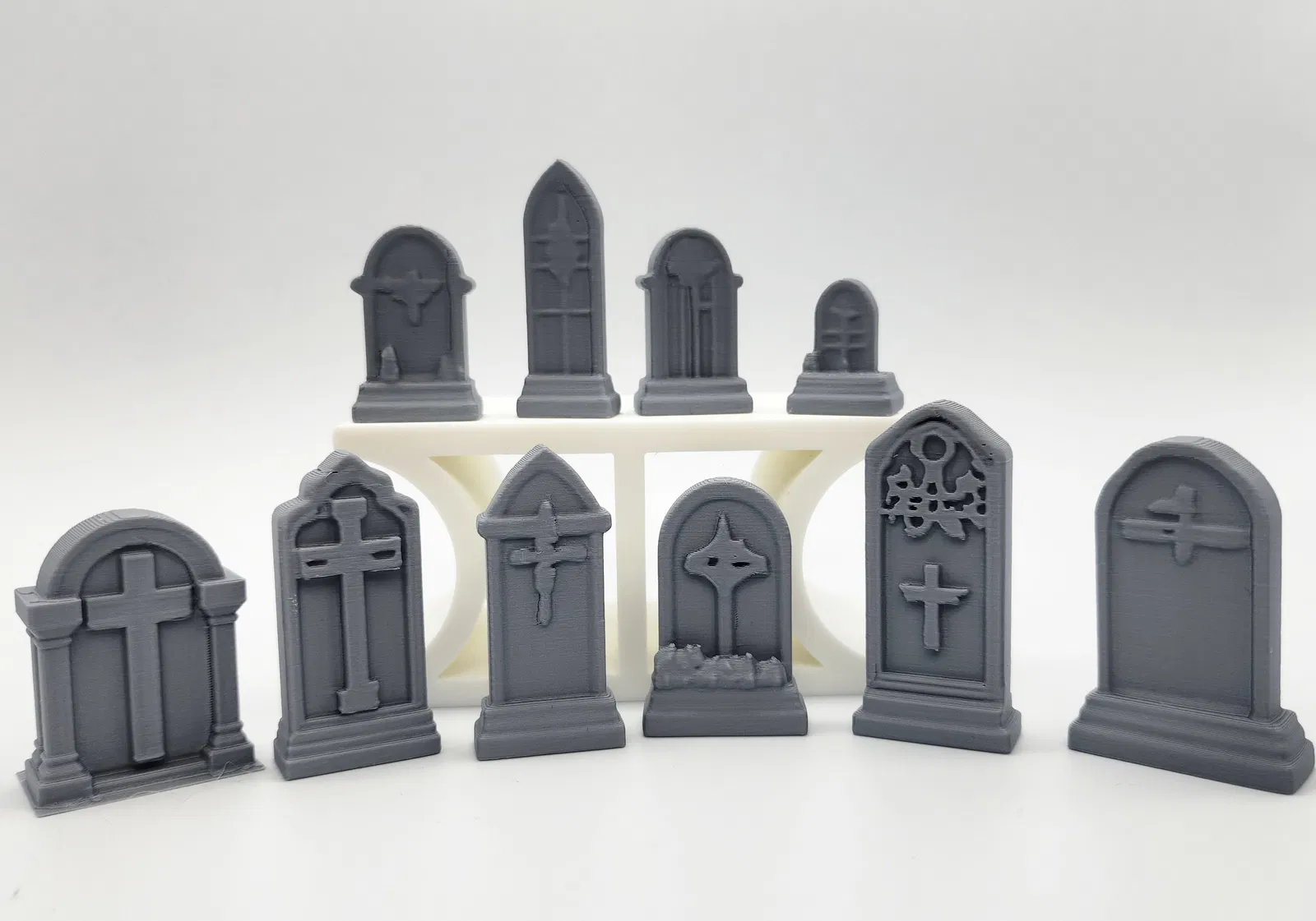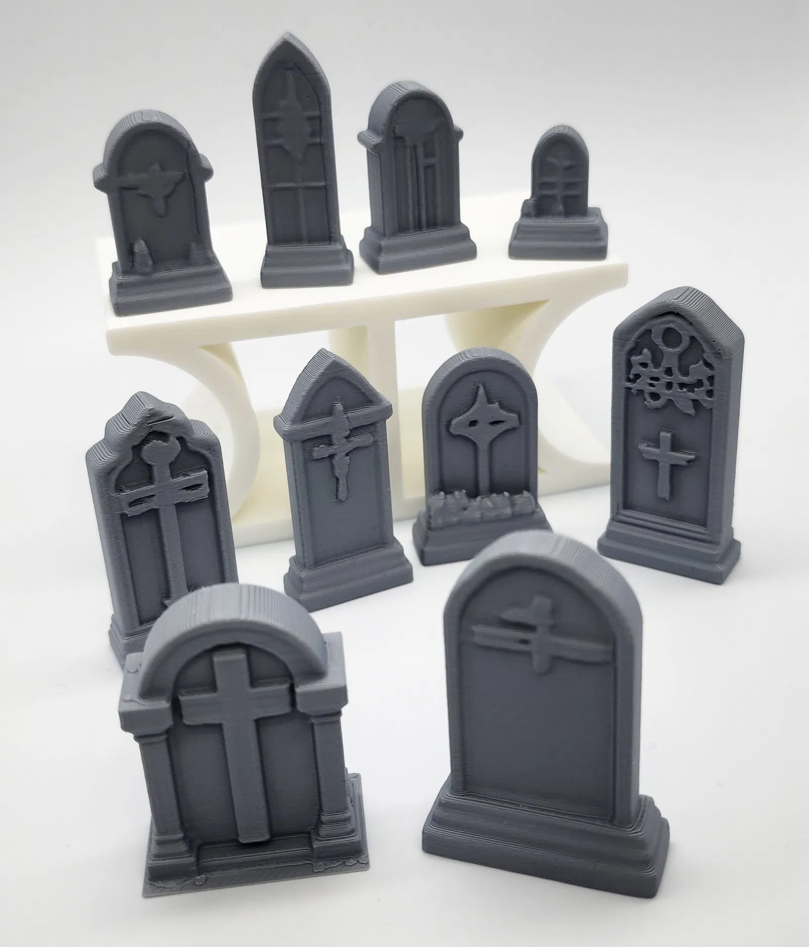 Bộ 10 bia mộ mini, hợp cho mô hình nghĩa trang, hầm mộ, dungeon, đầm lầy, nhà thờ hay bối cảnh u ám trong tabletop/RPG. Một số chi tiết có supports (giá đỡ) tùy chọn để in dễ hơn.