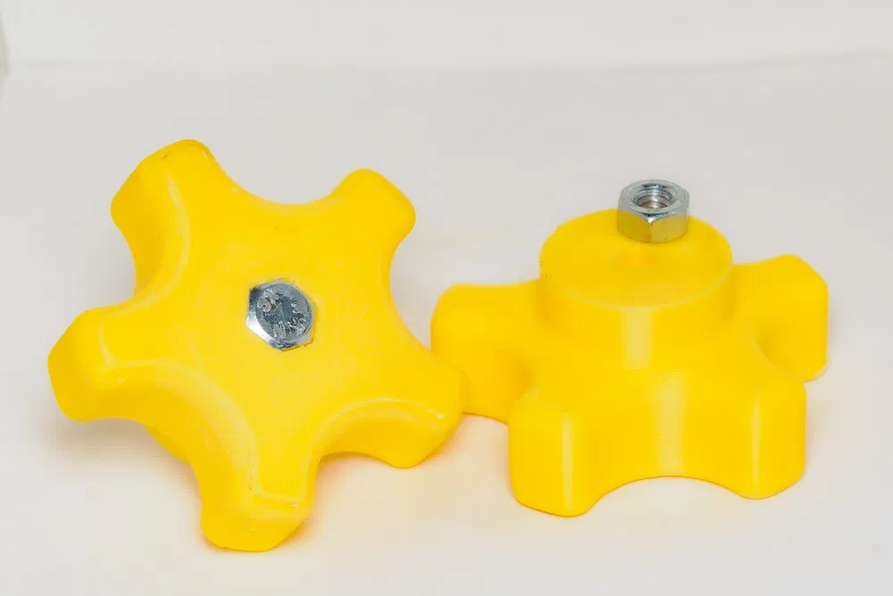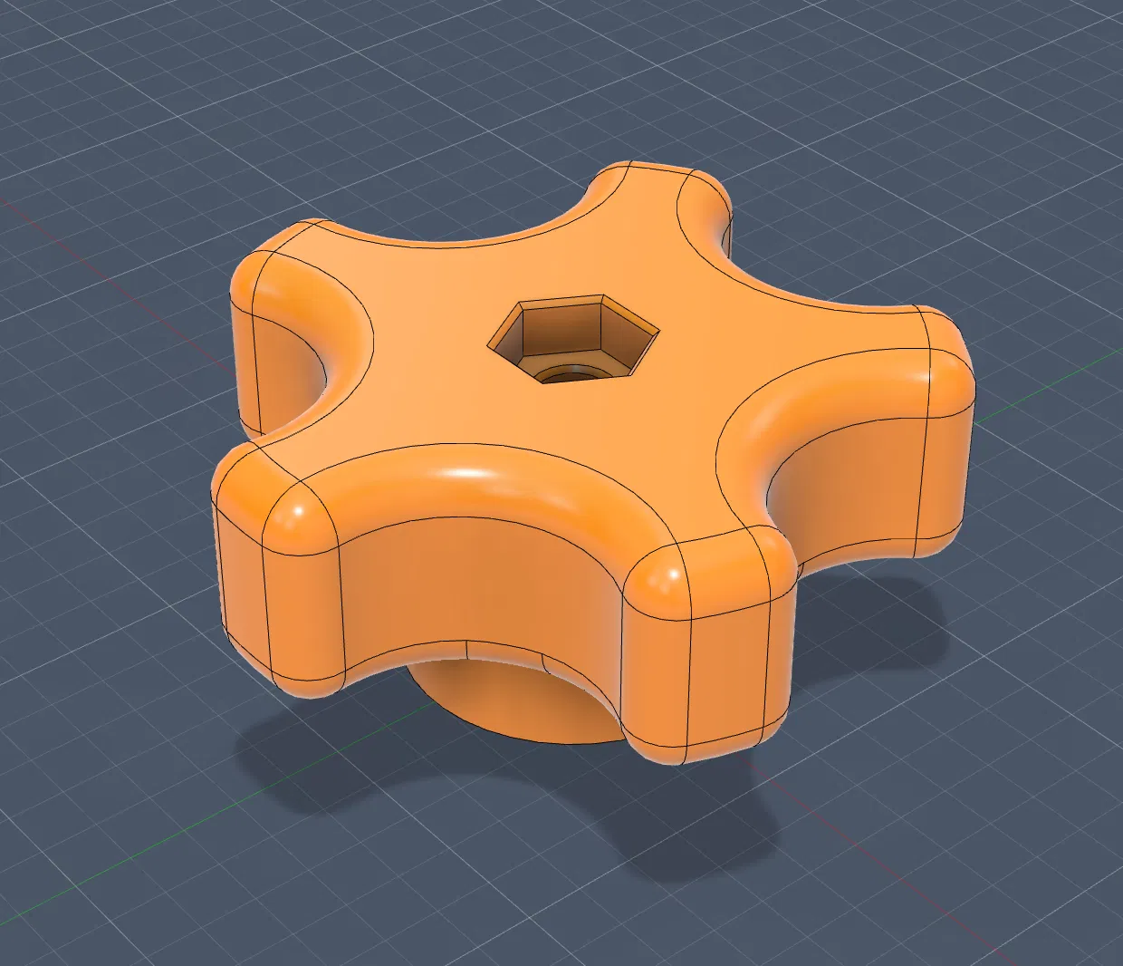Núm vặn hình sao bản cao (tổng chiều cao = 30mm) dùng cho nhiều loại đồ gá/fixture trong xưởng của bạn. Mẫu này nhận bulông hoặc ê-cu 1/4"x20 (ép chặt/press fit). Phần đế trụ phía dưới đường kính 30mm x cao 10mm, phần sao phía trên cao 20mm x rộng 65mm (± đo ngang qua các cánh sao). Các “rãnh bám ngón tay” có bán kính 12.5mm.