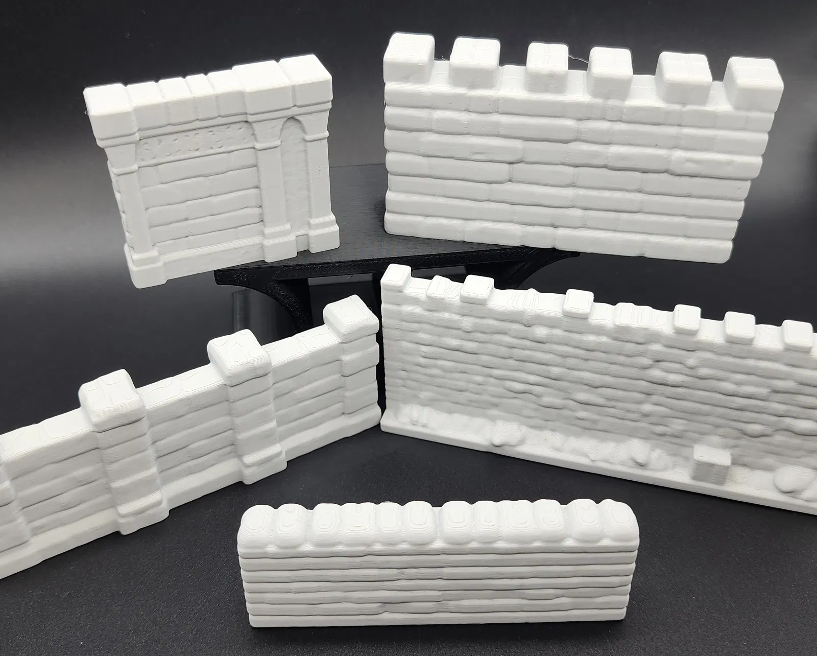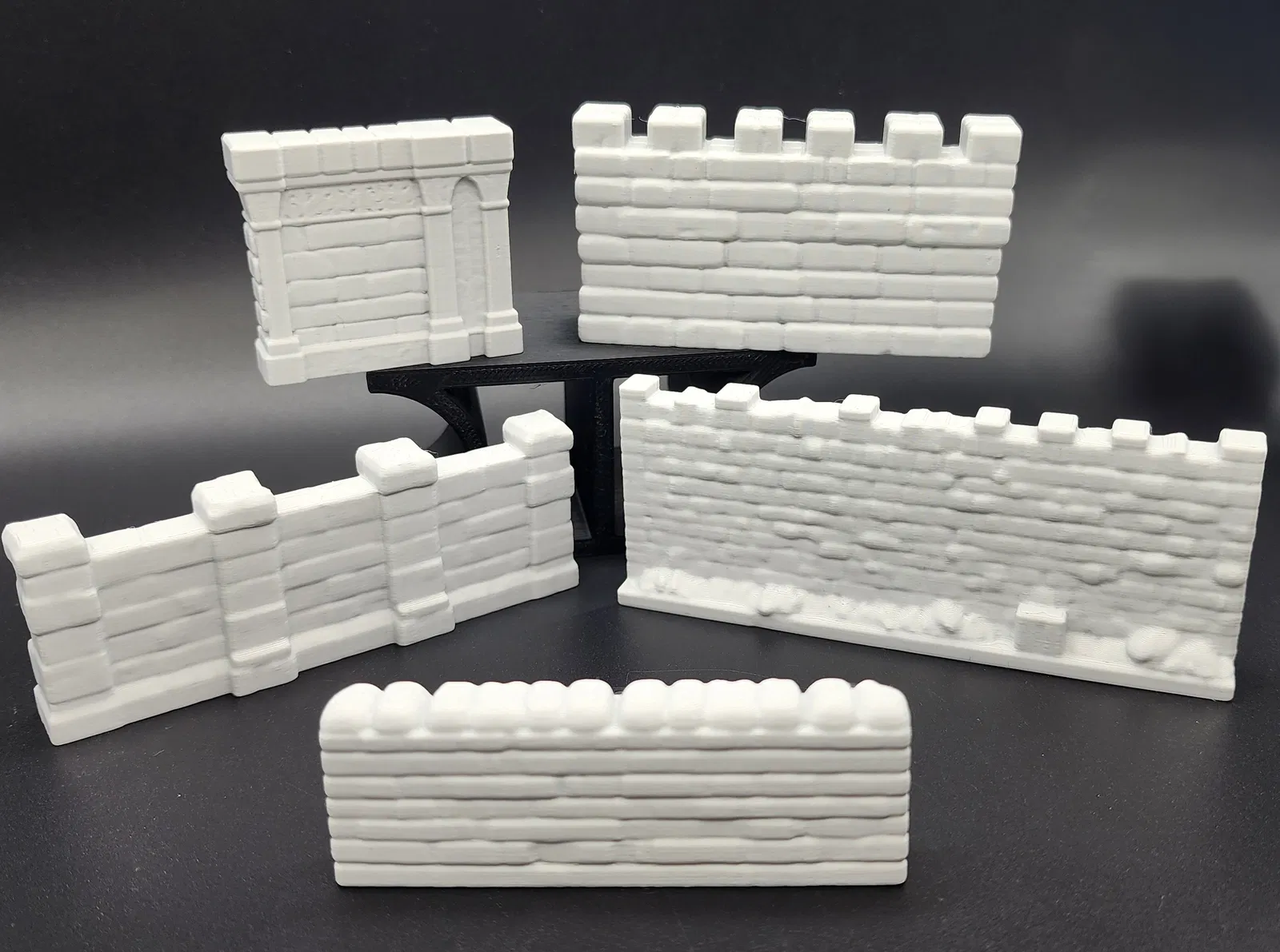 Bộ 5 mẫu tường đá mini gồm: tường nghĩa trang, tường đá cao, tường ngoài lâu đài, tường đá thấp và tường gothic ngắn. Rất hợp để dựng terrain cho game tabletop/RPG của bạn.