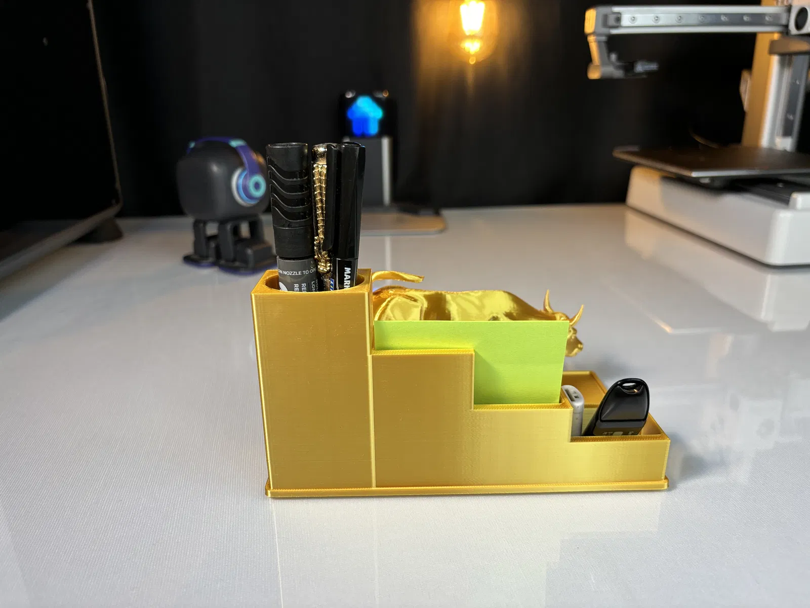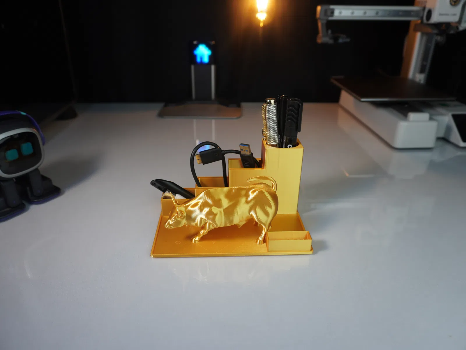 Mẫu in 3D này nổi bật với thiết kế chú bò ấn tượng ở mặt trước, tượng trưng cho sức mạnh và sự thịnh vượng. Phần organizer có các ngăn được thiết kế kỹ lưỡng để đựng bút, giấy note, ghim nhỏ và những món đồ văn phòng khác, giúp bàn làm việc của bạn gọn gàng mà vẫn có gu.