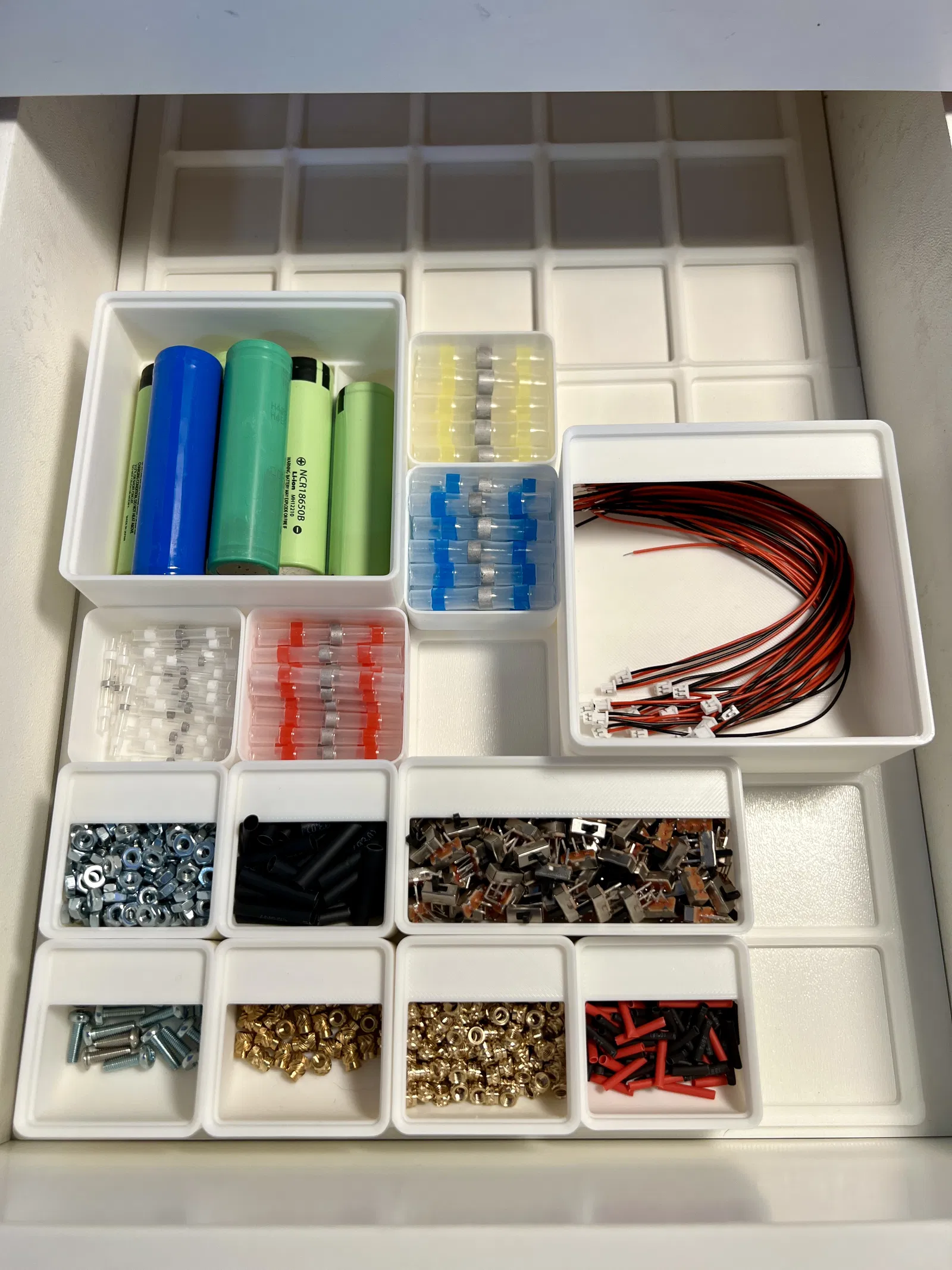 Sản phẩm bao gồm nhiều tấm đế nhỏ, ghép lại với nhau tạo thành một mặt phẳng hoàn chỉnh. Các tấm đế này có thể được in rời và ghép nối dễ dàng, phù hợp với các máy in 3D có khổ in nhỏ hơn như Bambu X1 hay P1. Khả năng tùy biến cao cho phép bạn sắp xếp không gian lưu trữ theo ý muốn, tối ưu hóa từng centimet trong ngăn kéo.