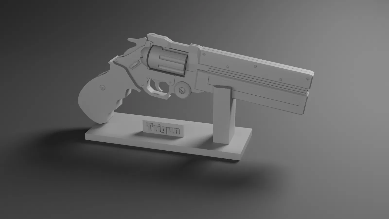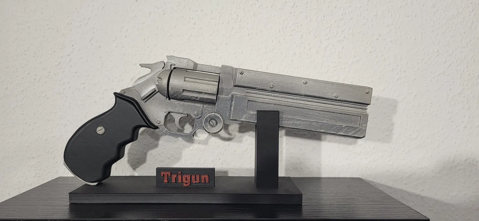 Mẫu revolver phong cách sci-fi từ series Trigun đời cũ (Vash the Stampede). Nên in làm 2 nửa rồi dán lại để hạn chế fail; in nguyên khối thường cần rất nhiều support. Gợi ý: layer height 0.08mm, tree supports.