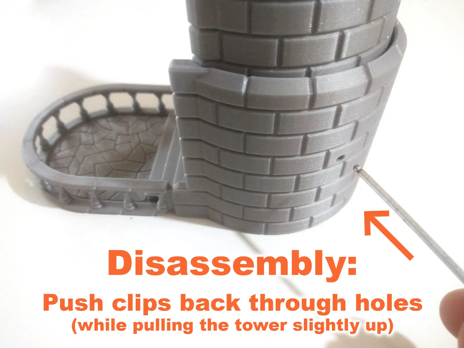 Chỉ cần thả lò xo coil vào đúng chỗ (hoặc trượt lò xo in vào rãnh), rồi đẩy phần top của tower xuống. Nó sẽ “click” vào vị trí; nếu dùng lò xo in thì có thể bạn cần đẩy nhẹ phần top lùi về sau một chút. Nếu bạn muốn tháo cái “lâu đài” ra lại, sẽ có hai lỗ ở bên hông để bạn gỡ các ngàm (clips) đang giữ lâu đài dính với nhau.