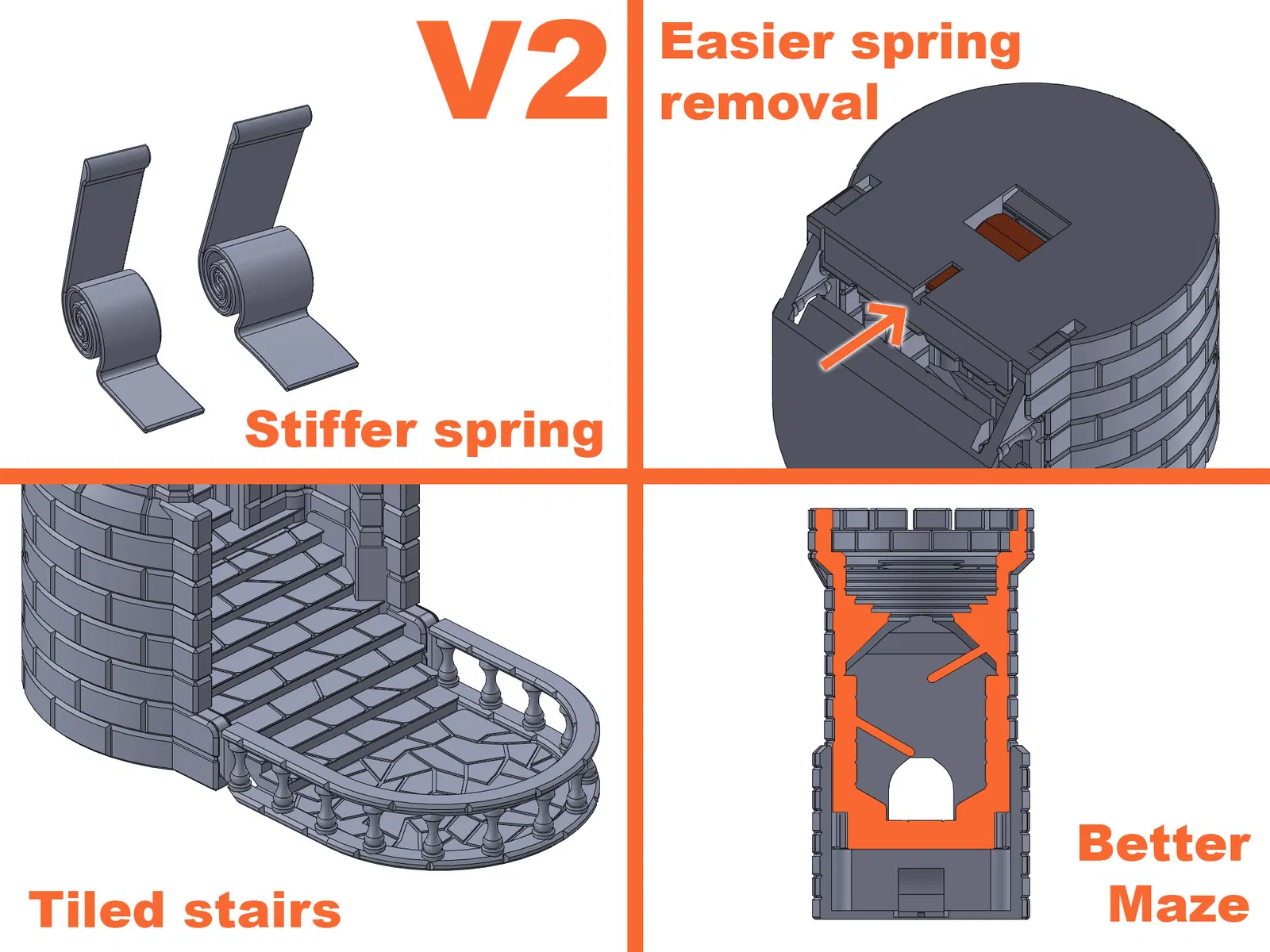 Trong file in có kèm một lò xo in được, nhưng do hiện tượng creep, lò xo này có thể bị “đuối” theo thời gian và không nâng phần nắp của dice tower lên lại (nhưng thay cũng dễ). Vì vậy khuyến nghị dùng lò xo 80*8mm (amazon/bambu/etc).