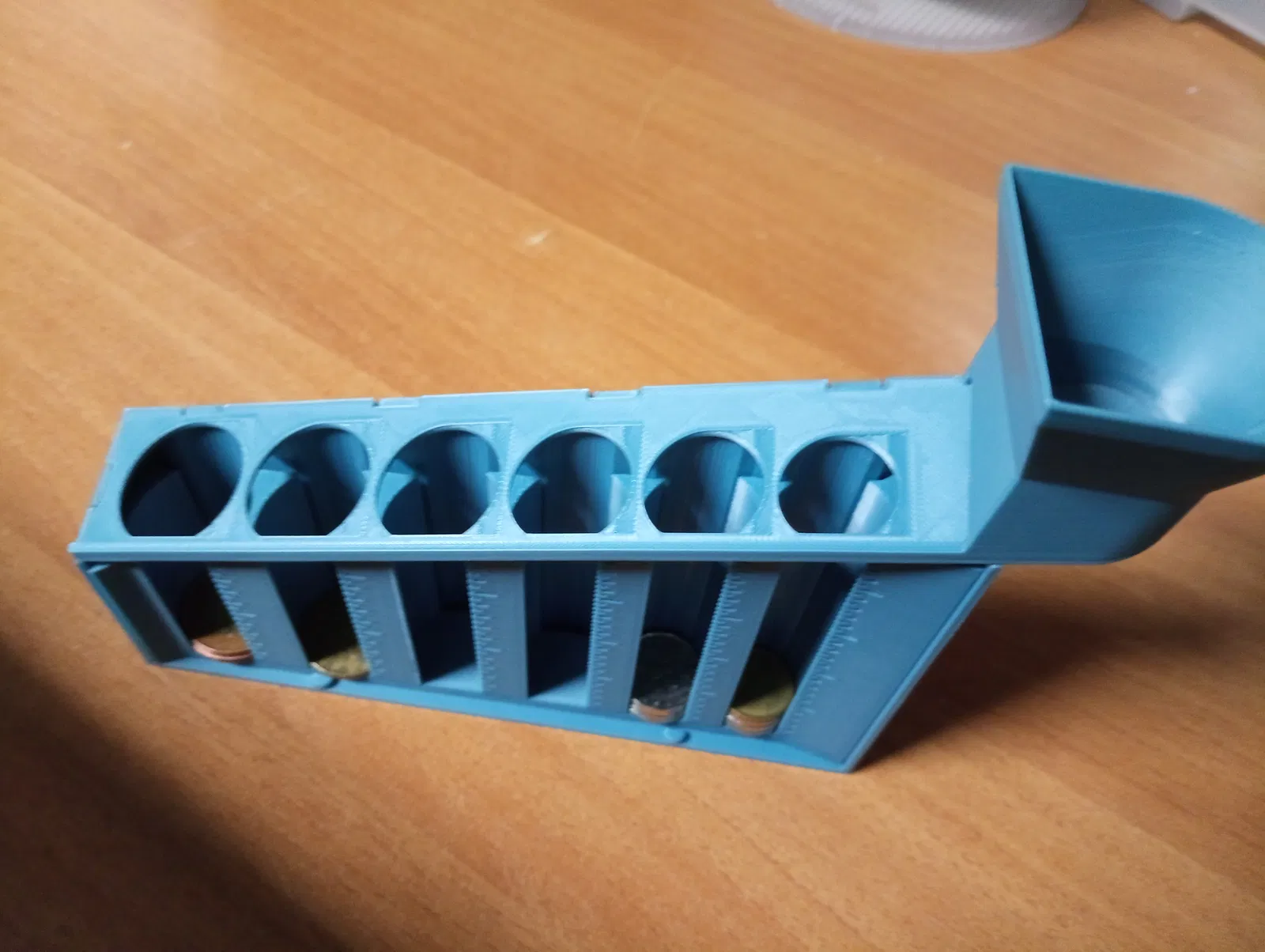 Bộ chia xu cho đồng korun Séc. Chỉ cần thả từng đồng vào phễu/miệng nạp và xem kết quả. Mỗi đồng sẽ rơi xuống đúng ngăn chứa riêng, tùy theo mệnh giá.