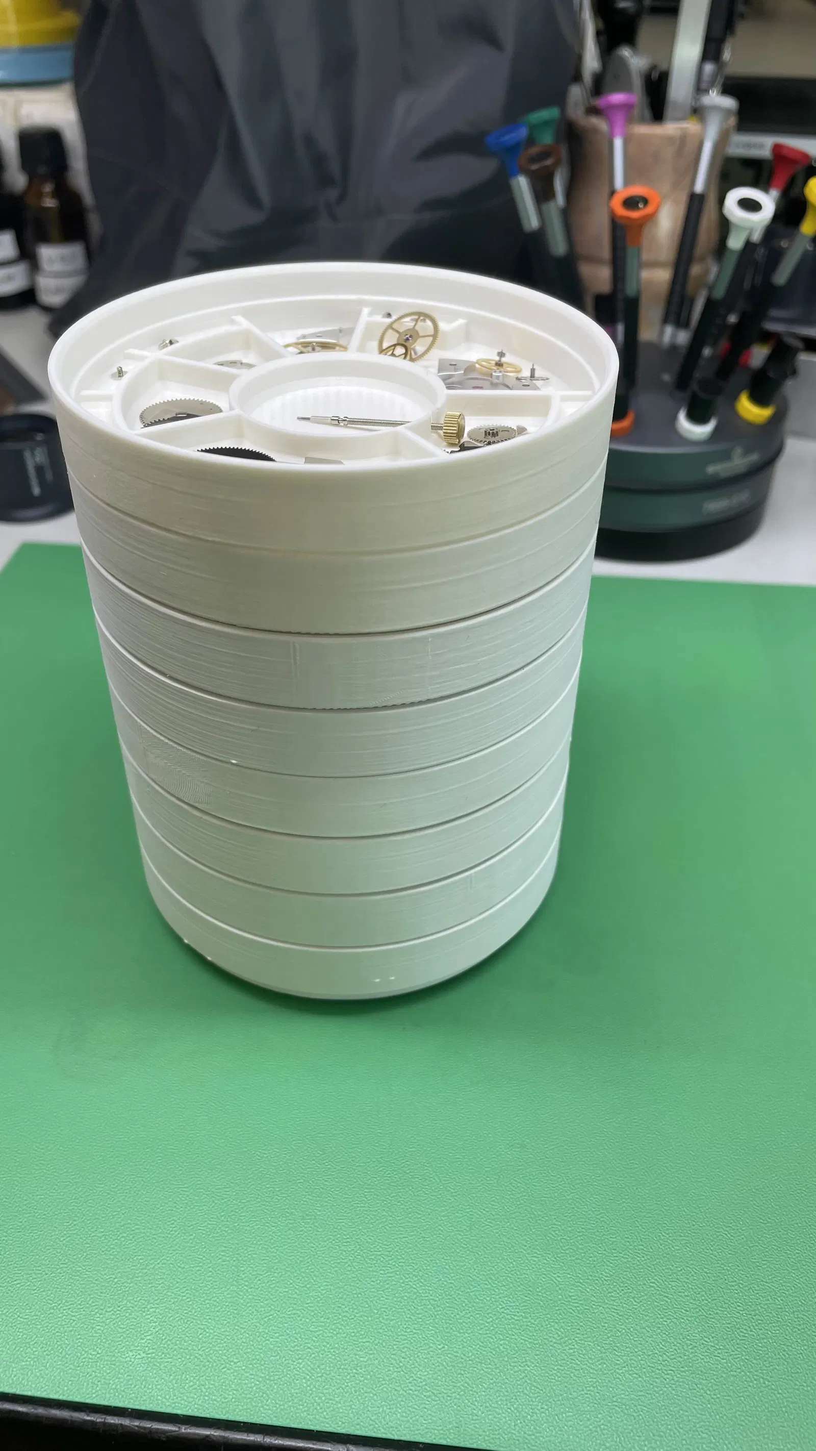Phiên bản Watch Maker Trays do mình tự thiết kế, tối ưu cho máy đồng hồ cơ automatic như ETA 2824-2 nhưng vẫn dùng универсал. Mỗi khu vực chia theo từng cụm, có chỗ để ốc/vít và rãnh cho winding shaft. Khuyên in với organic supports.