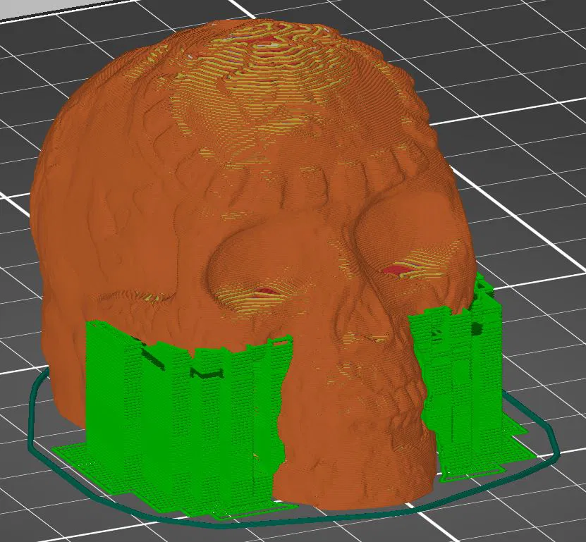 - Hỗ trợ (Supports): Có thể cần thiết, đặc biệt là phần má của đầu lâu (xem ảnh 2). Bạn có thể tô màu hỗ trợ trực tiếp lên mô hình trước khi in để dễ dàng loại bỏ sau này.
