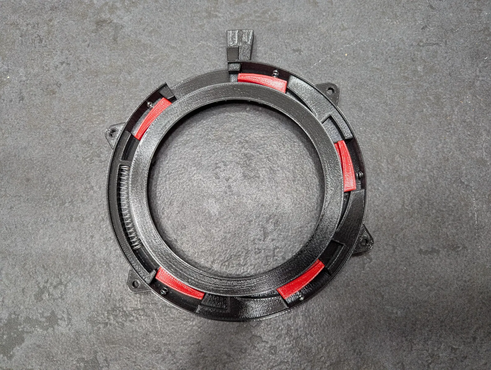 Mình đổi cụm rotating pins thành một cam dùng Archimedean spiral. Cách này đỡ (support) hoàn toàn cho các latch trong lúc rút vào, nên chúng không bị nghiêng lệch rồi kẹt.