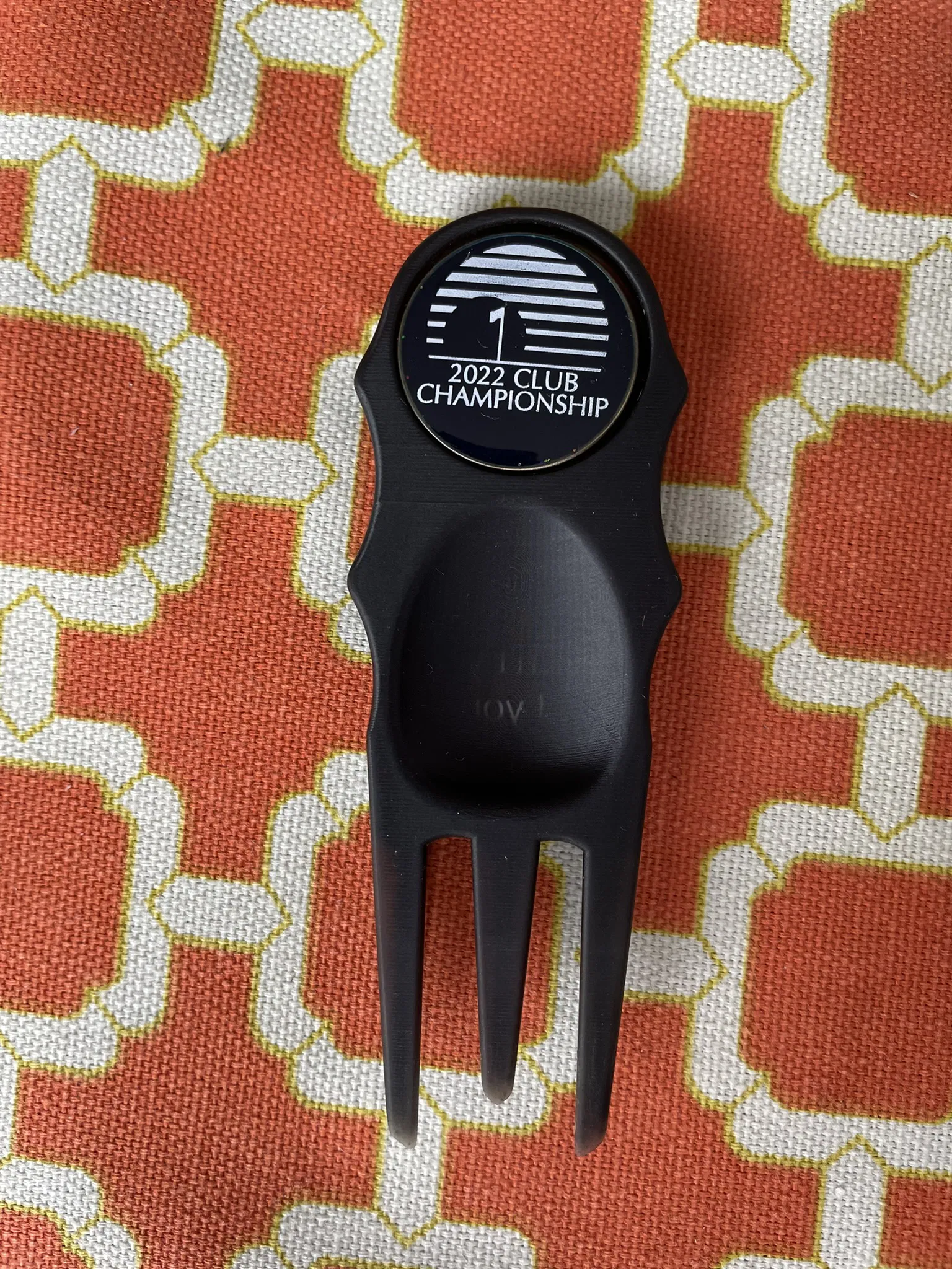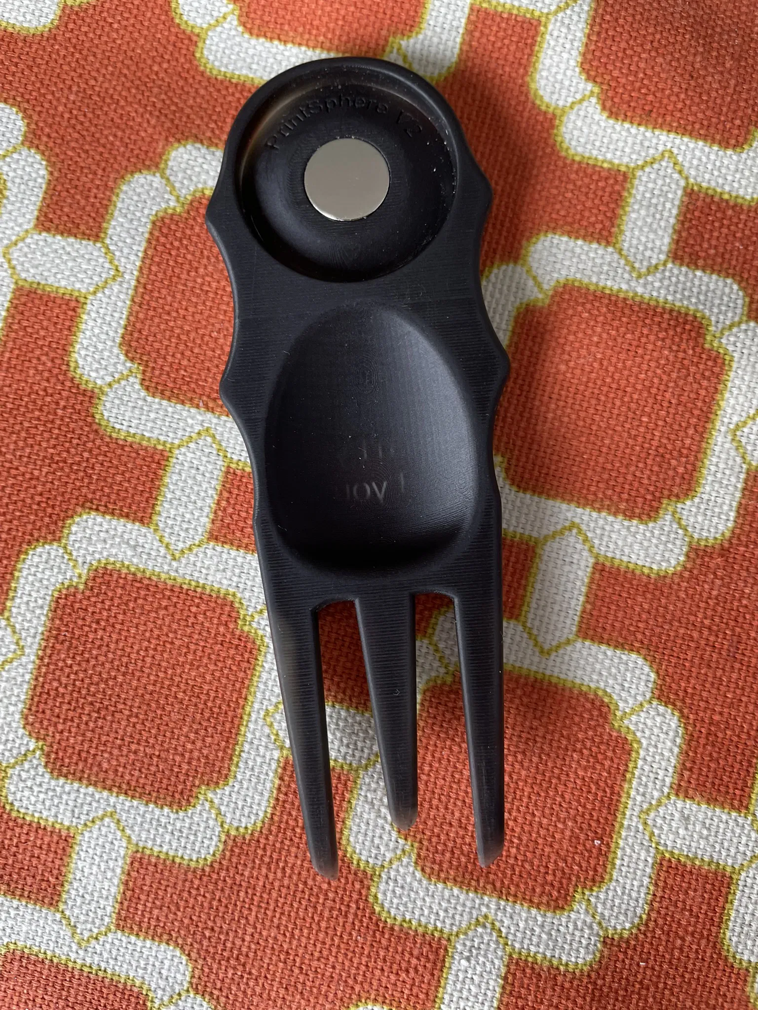 Dụng cụ sửa divot cho golfer có ý thức, kèm ball marker holder dùng nam châm (khe nam châm lộ). Thiết kế cầm nắm công thái học, giúp nắn mép vết bóng để mặt green phẳng mượt hơn.
