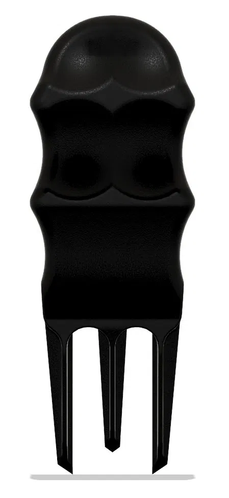Divot repair tool - Thiết kế công thái học với vùng đặt ngón cái và ngón tay rõ ràng. Cầm chắc tay và ấn các mũi (spikes) thẳng đứng xuống bề mặt sâu khoảng 3–4cm dọc theo mép ngoài của vùng bóng tạo vết (divot). Tiếp theo, đẩy dụng cụ hướng vào trung tâm vùng va chạm rồi rút dụng cụ ra. Lặp lại quy trình ở 3 cạnh vuông góc còn lại của vùng va chạm.
