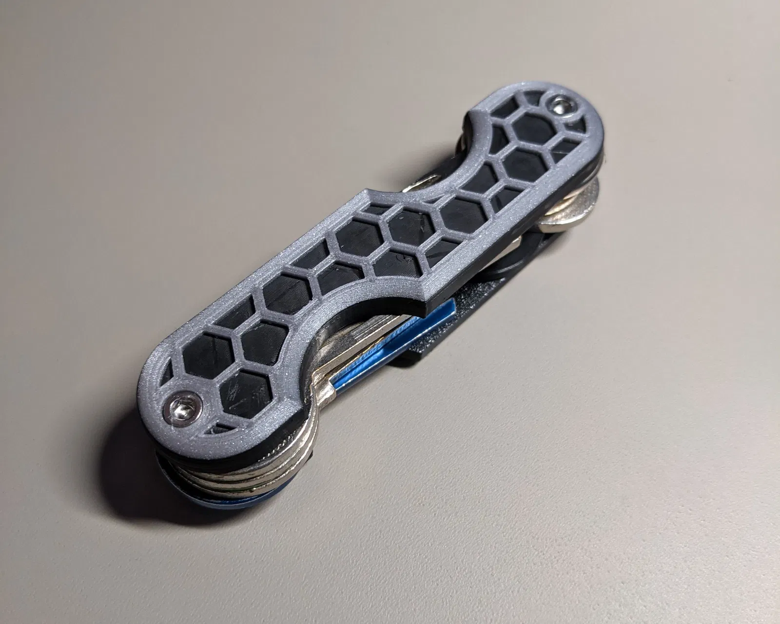 Một mẫu Swiss key holder khác, tối ưu cho các chìa dài hơn. Thiết kế dùng 2 bulông để vừa bộ chìa tốt hơn, in PLA không cần supports. Có bản 2.0 nếu muốn dùng threaded inserts thay ê-cu.