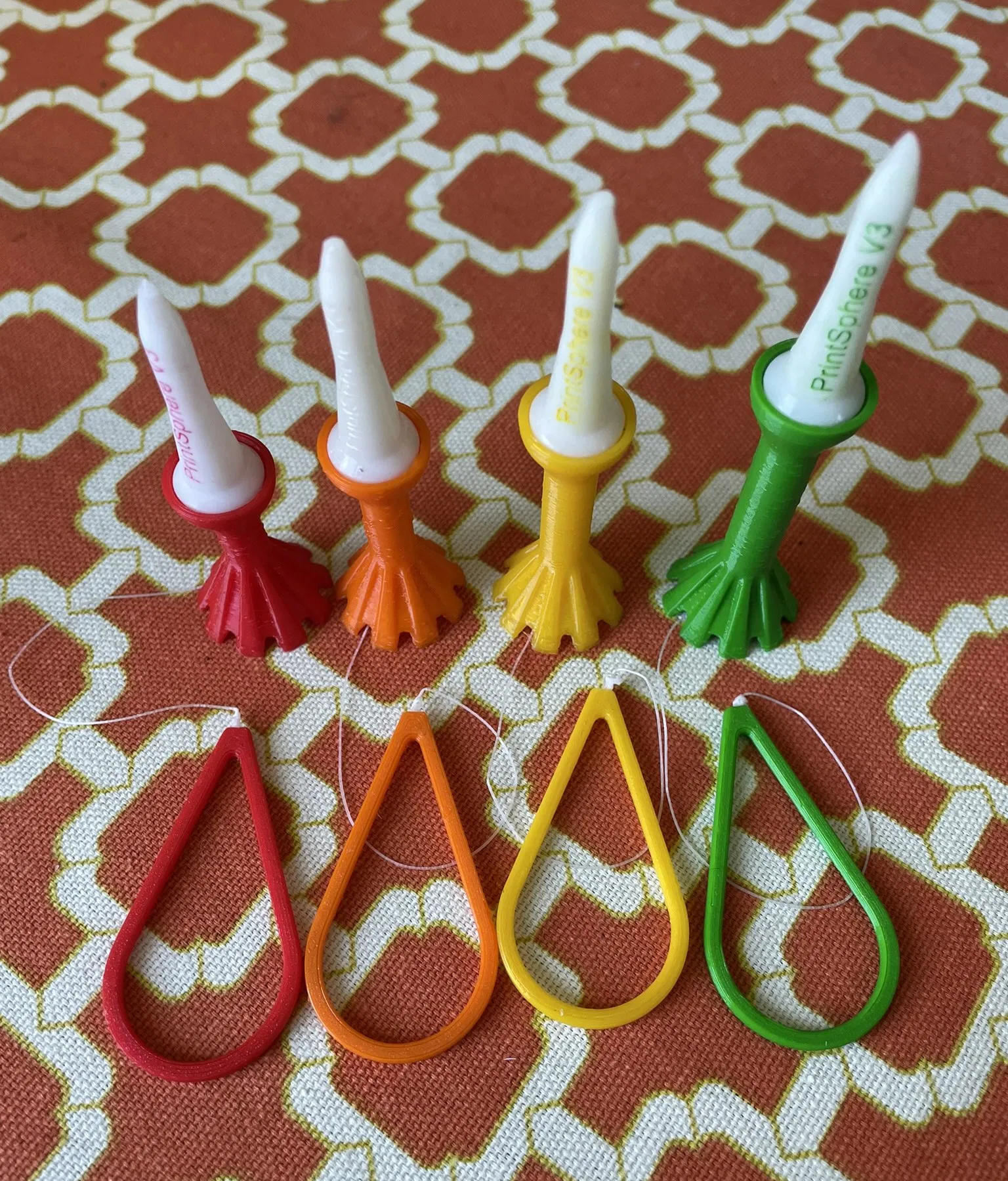 Bộ tee golf cho gậy driver với 4 chiều cao (1.25–2 inch), kèm anchor và handle nối bằng dây câu 20lb để giảm gãy, hạn chế thất lạc và dễ nhặt/lấy lại. Gợi ý in TPU (FDM) và Ultra Tough Resin (SLA).