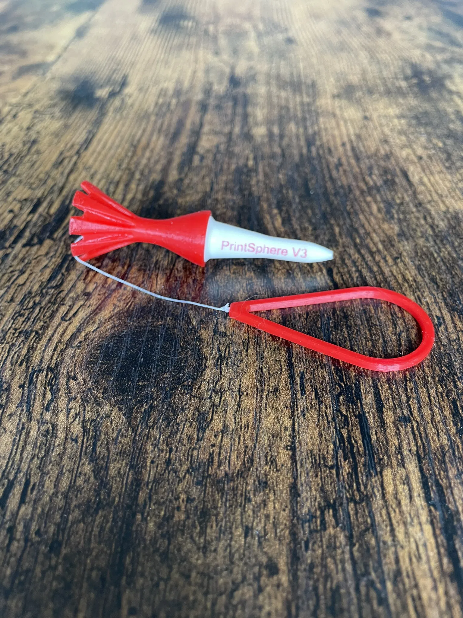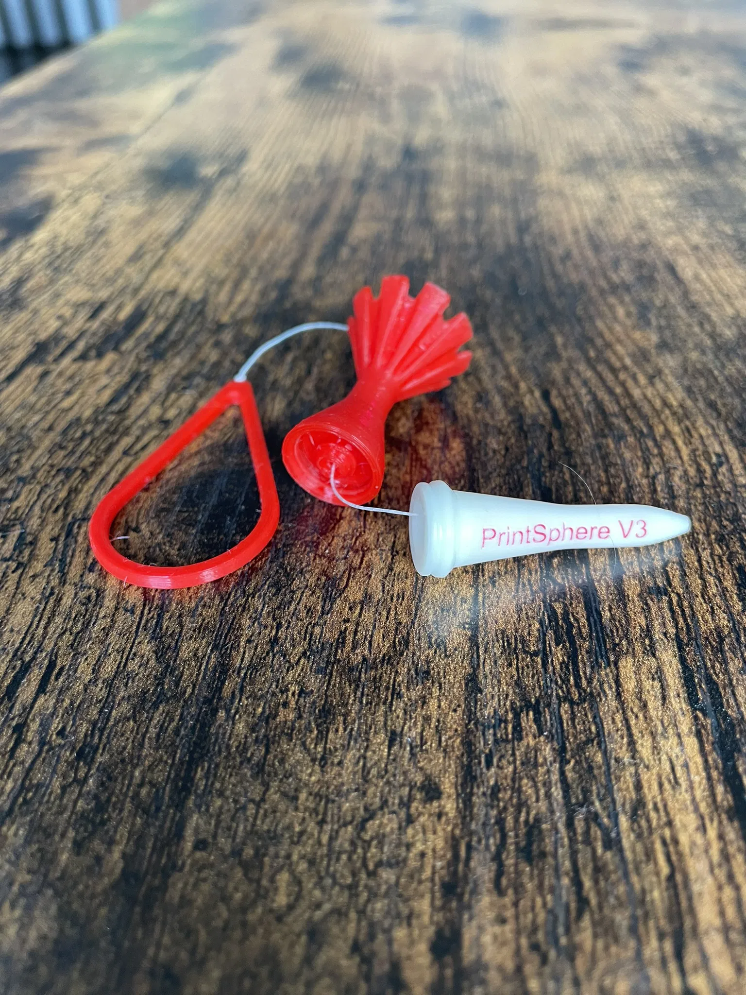 Version 3 khó gãy hoặc khó mất hơn, đồng thời cũng dễ nhặt/lấy lại hơn. Bản này gồm 4 phần (3 phần in) với Tee và handle dùng TPU trên máy FDM, còn anchor dùng Anycubic Ultra Tough resin trên máy SLA. Phần đầu tee (tee head) bấm khớp (snap) vào anchor; có dây câu 20lb nối anchor, luồn qua tee head rồi chạy tới handle (ở đầu dây bên kia).