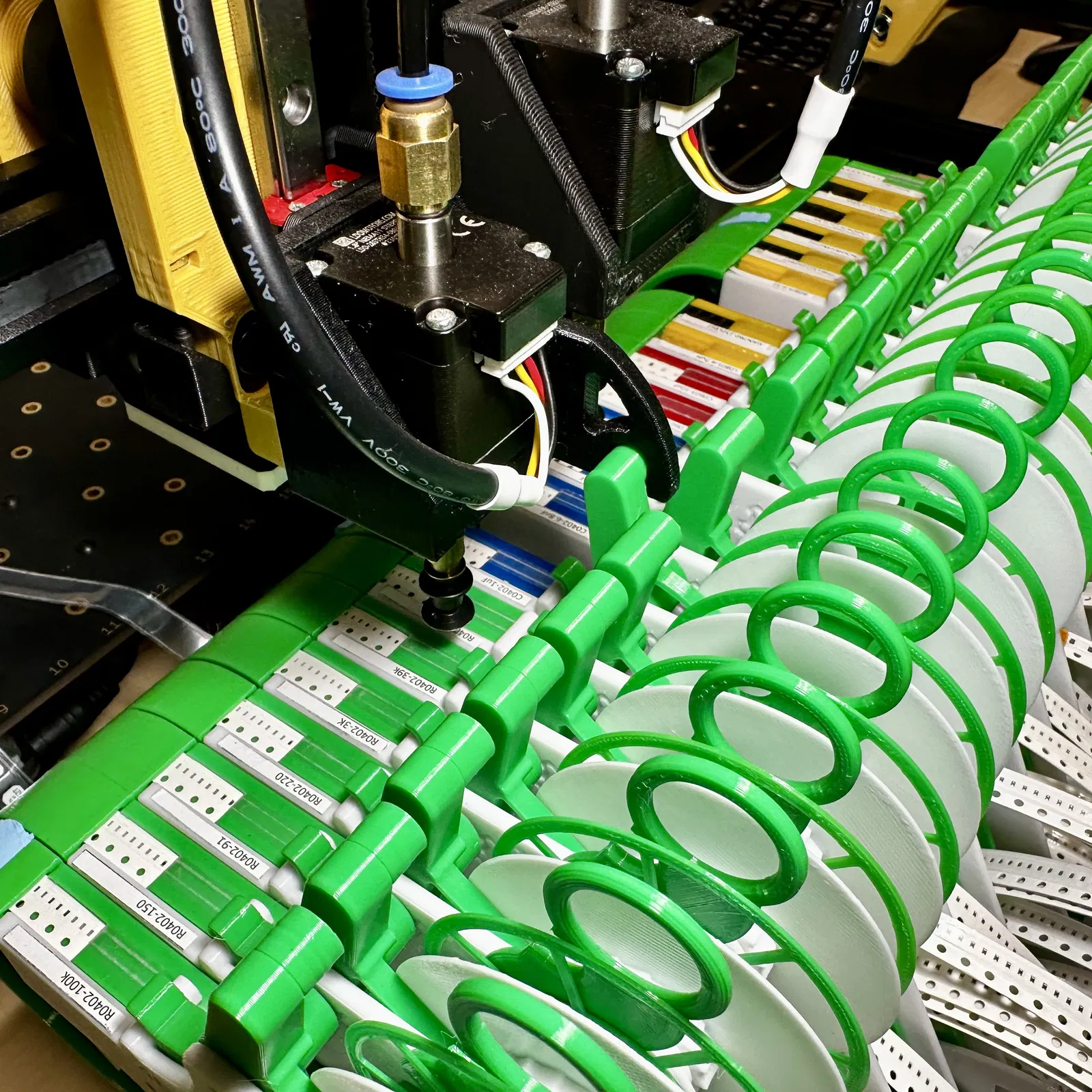 LƯU Ý: Mình có kèm các bản .STL của feeder của Mark mà mình export từ các model OpenSCAD của ảnh và có chỉnh nhẹ để chạy với LumenPNP của mình. Mấy file này chỉ nhằm tiện cho bạn, và mình không đảm bảo là sẽ hoạt động ngon với máy in của bạn. Mọi quyền lợi, trademark, copyright và các quyền khác đều thuộc về Mark, và mình khuyến khích bạn xem thiết kế gốc tại đây: