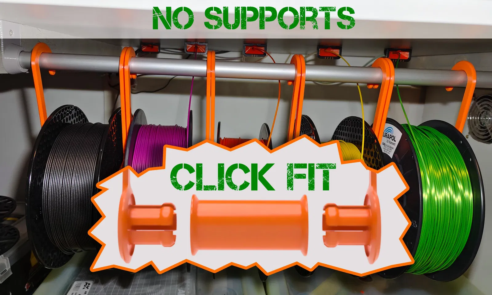 Giá treo cuộn filament thực dụng, dễ dùng, giúp thay cuộn nhanh gọn và treo lên thanh tủ đường kính 2cm. Lắp snap-fit hai bên, không cần supports. Tối ưu cho MMU, khuyến nghị in PETG.