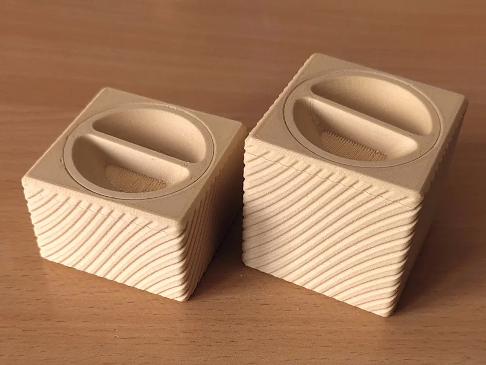 Hộp vuông trang trí dạng lập phương, có thêm bản thấp hơn, dùng nắp vặn ren print-in-place (PIP). In tốt với PLA và cả Prusament woodfill linden trên nozzle 0.4mm; sau khi “ráp” ren lần đầu sẽ vặn mượt.
