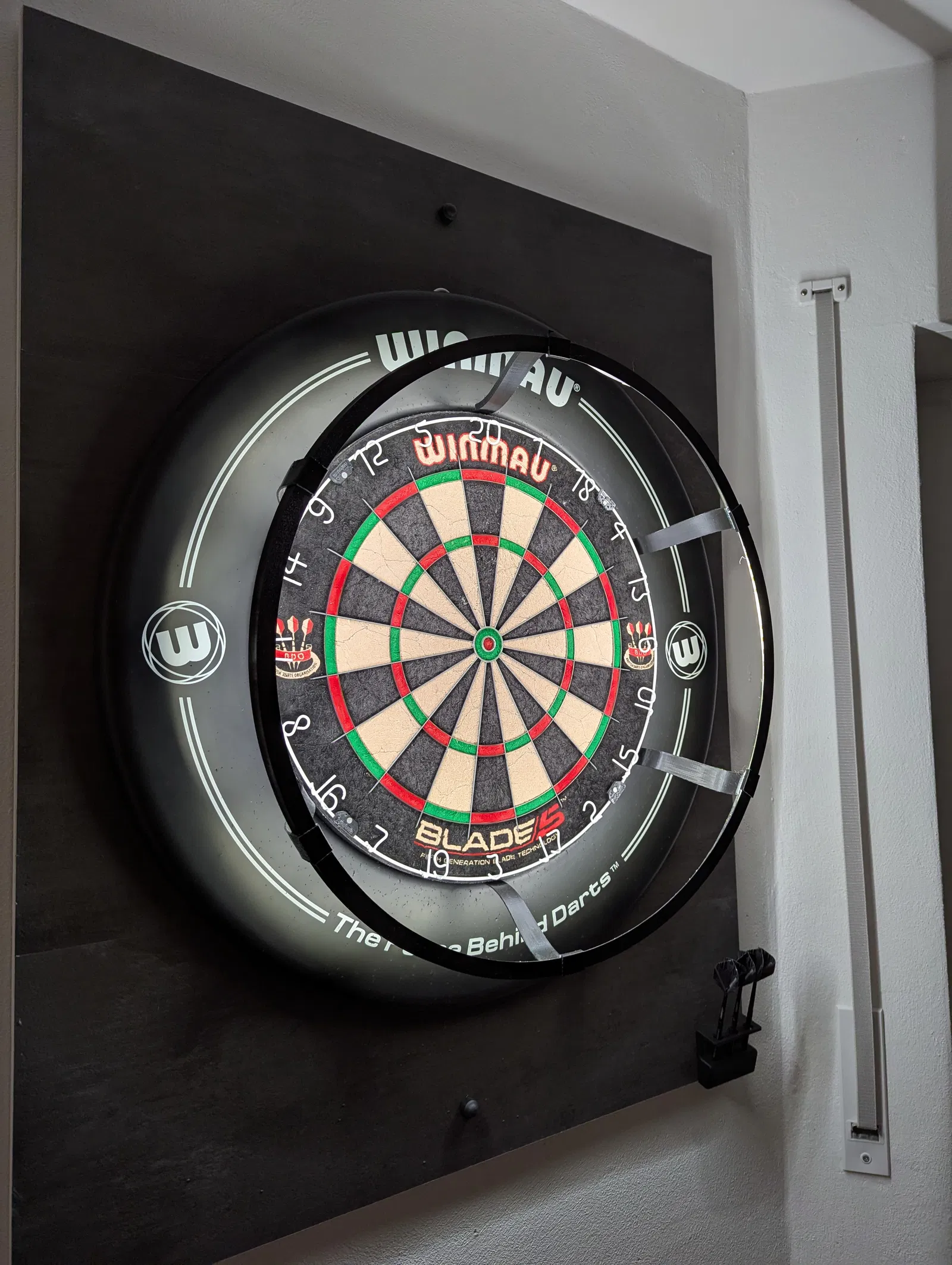 Kết cấu vòng đèn để gắn LED stripe chiếu sáng dartboard. Thiết kế kẹp giữa dartboard và surround, vòng chia 6 mảnh giống nhau, lắp bằng chân đỡ và miếng nối; có thêm bản có rãnh đi dây và chỗ để powerbank nhỏ.