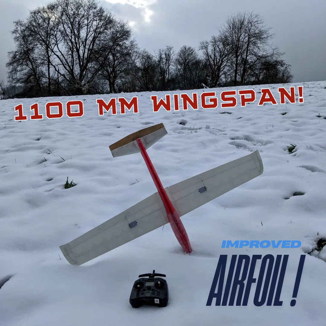 Bộ cánh mới cho phiên bản LIDL-Glider đời cũ: sải cánh 1100 mm, airfoil RG-15 tốt hơn. Chủ yếu in LW-PLA (Vase-Mode), vài chi tiết in PLA thường. Cần ống carbon 6 mm và 2 servo 9 g.