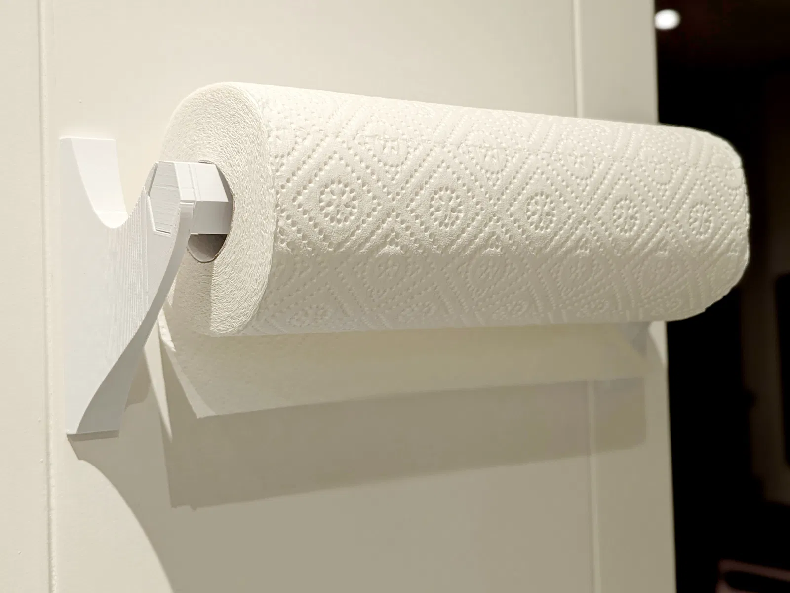 Giá treo cuộn giấy bếp gắn tường, dễ in và lắp ráp, dán bằng băng keo hai mặt/Command strips. Phù hợp cuộn cao đến 30 cm, đường kính 12,5–13 cm. Có file 3MF và FreeCAD để tùy biến.