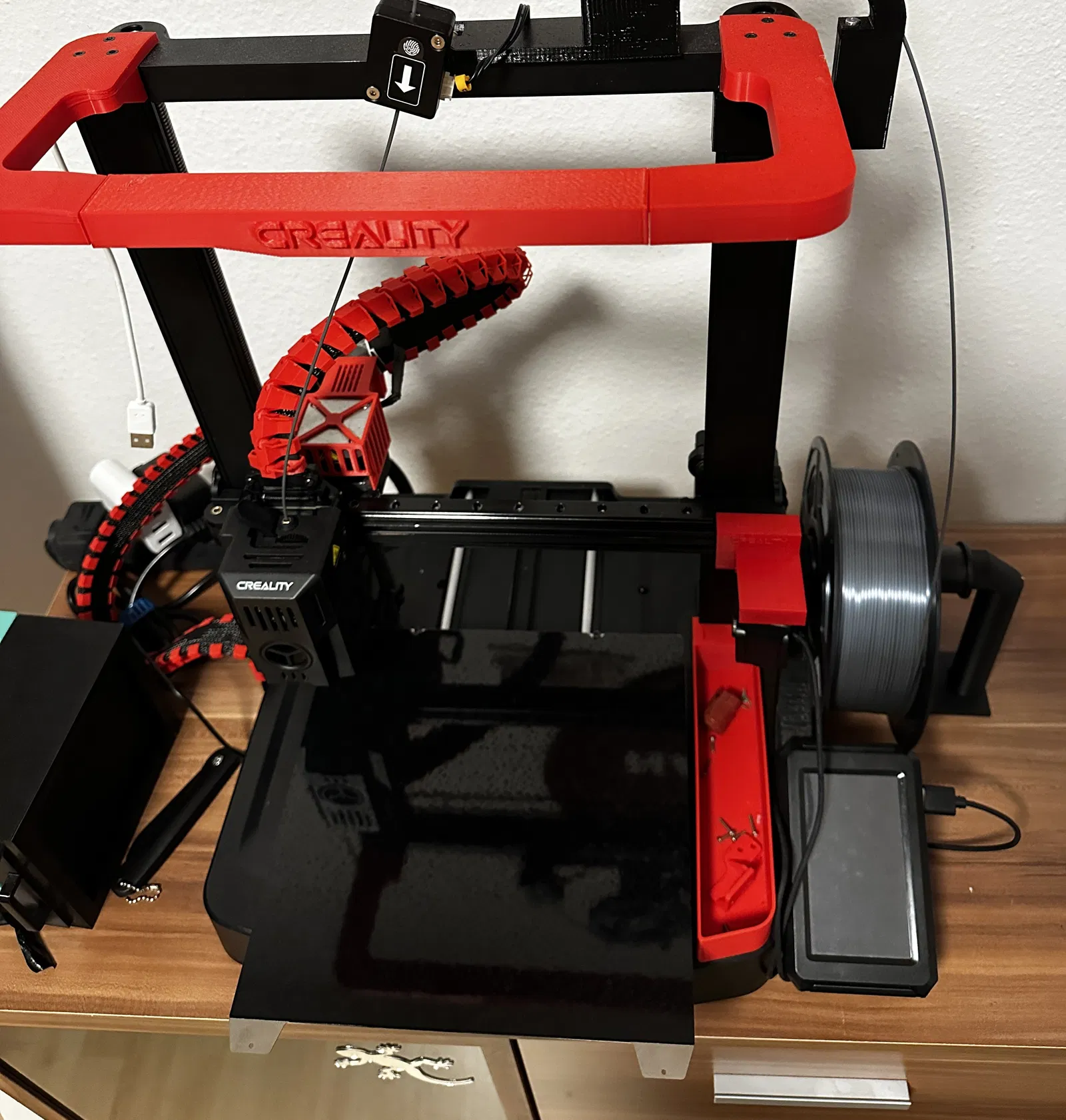Mình rất thích cái side mount, nhưng để ý khi filament bị kéo thì cuộn (spool) vẫn còn bị lắc. Để khắc phục, mình làm một cái stand đơn giản, trượt vào lỗ ở bên phải của spool holder nguyên bản. Không cần dụng cụ gì hết, và tới lúc thay cuộn mới thì chỉ việc kéo trượt ra là xong.