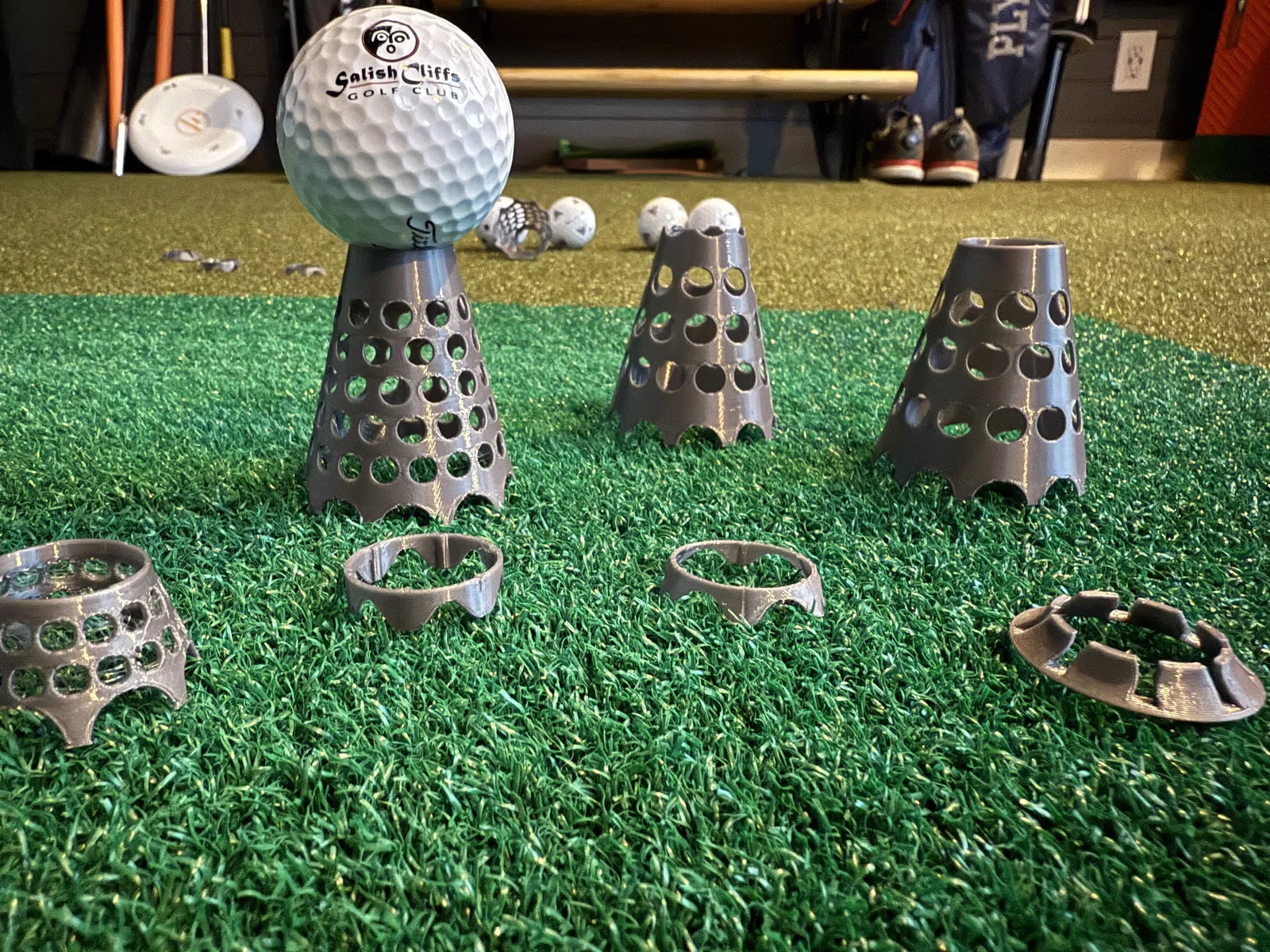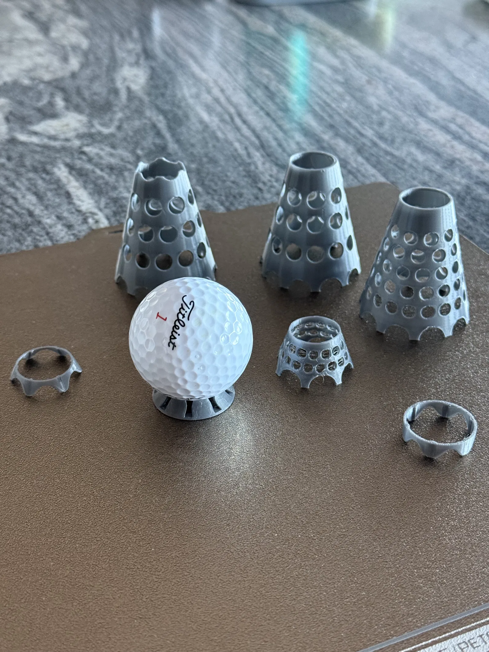 Sau nhiều lần thử đi thử lại (trial and error) tụi mình mới ra được mấy cái tee này cho sim golf. Vấn đề của nhiều loại tee bán sẵn là khi đánh vào thì nó bật lên rồi bay tứ tung. Mấy cái này được thiết kế để giảm ricochet ở mức tối thiểu, đa phần sẽ nhả theo hướng về phía trước, về phía màn hình. In bằng TPU để bền hơn và chịu va đập tốt hơn. Nó sẽ không bị vỡ khi va chạm như PLA.