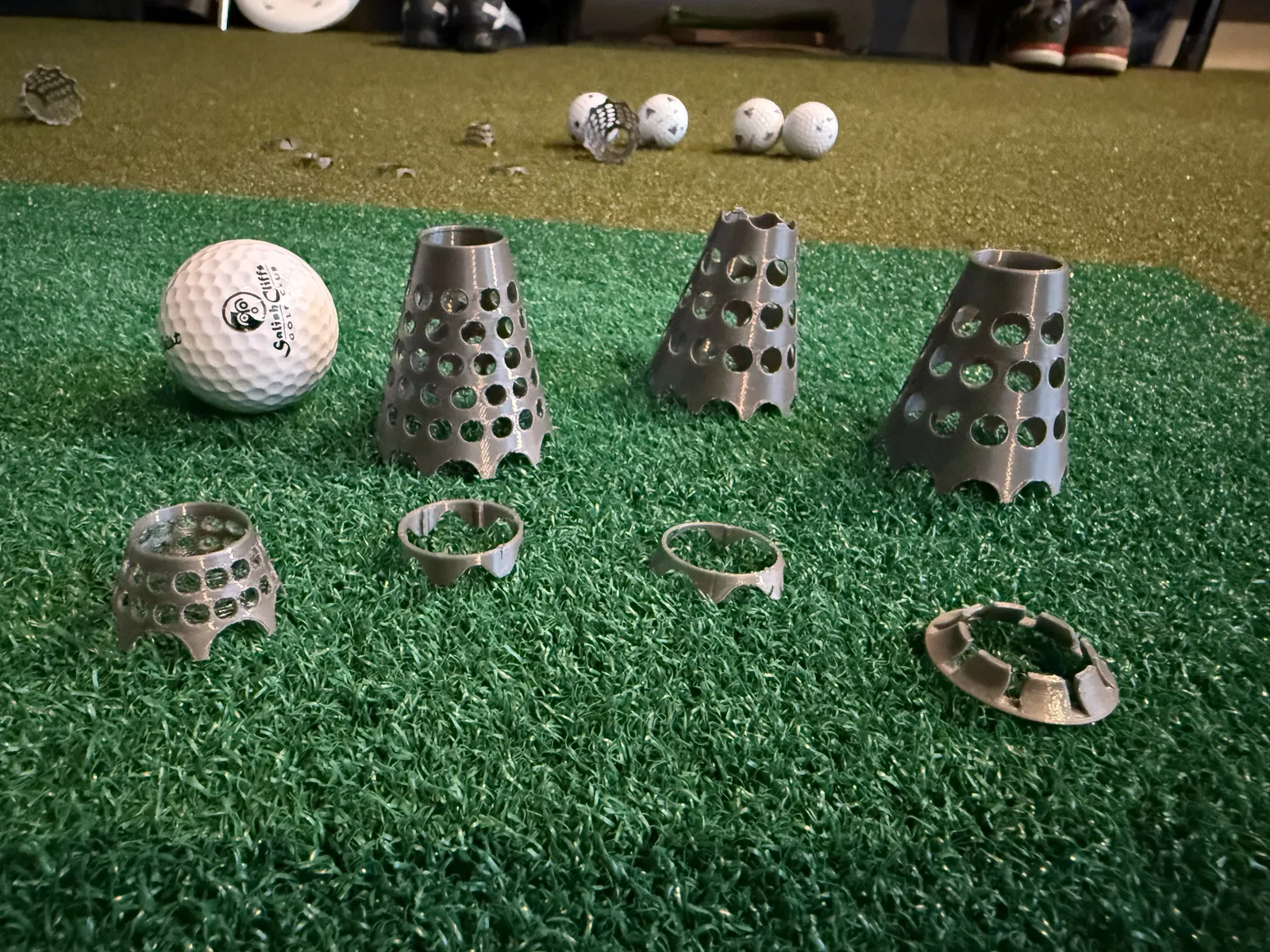 Sau nhiều lần thử tới thử lui tụi mình mới ra được mấy cái tee này cho sim golf. Vấn đề của nhiều loại tee ngoài thị trường là khi bạn đánh trúng thì nó bật lên, bay tứ tung. Mấy cái này được thiết kế để hạn chế dội/ricochet tối đa, đa phần sẽ nhả và trượt về phía trước, hướng về màn hình. In bằng TPU để bền hơn và chịu va đập tốt hơn. Nó sẽ không bị bể/giòn khi va chạm như PLA.