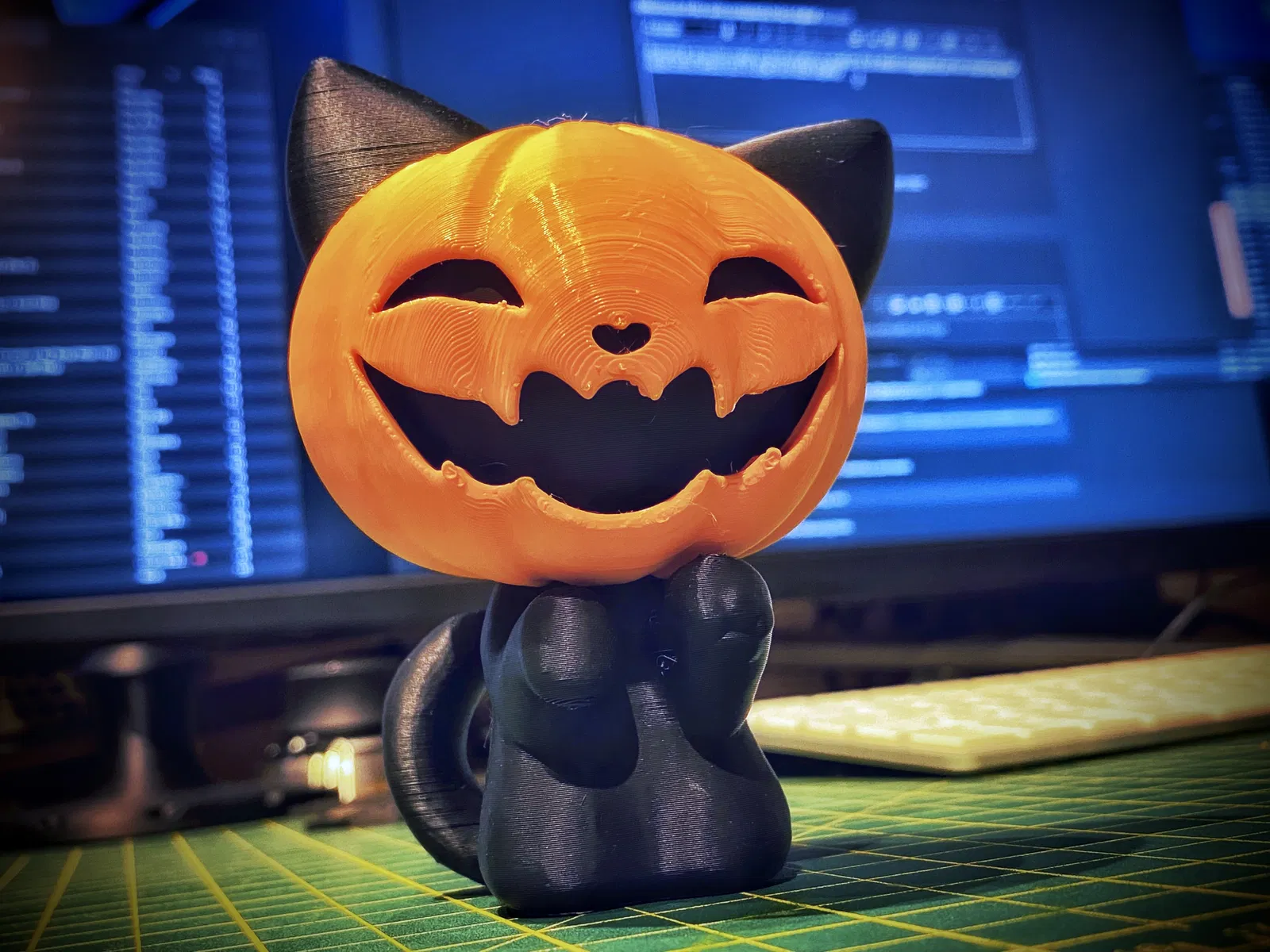 Bản Pumpkin Cat REMIX - FIXED đã chỉnh sửa để sẵn sàng in và lắp ráp dễ hơn. Hướng dẫn layer 0.2–0.1mm, thêm supports đúng vị trí, giảm tốc với Custom G-code khi tới chi tiết mặt nạ bí ngô, rồi dán các phần lại.