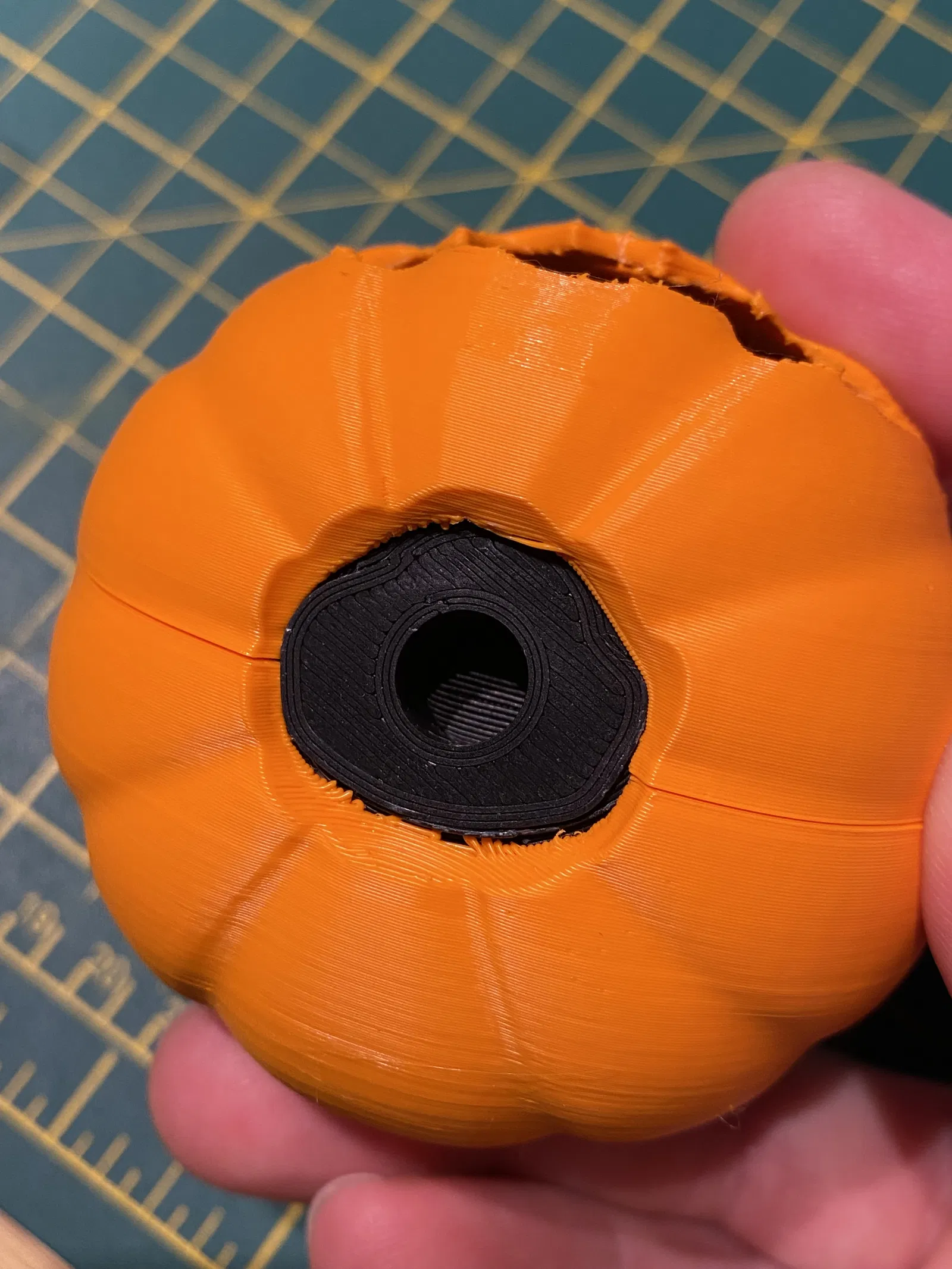 Giảm tốc độ in khi tới phần chi tiết trên mặt của pumpkin mask và dùng adaptive layers nhỏ hơn trên pumpkin mask để các đường layer bớt lộ trên mặt. Chèn Custom G-code để giảm tốc độ in ở giữa quá trình.