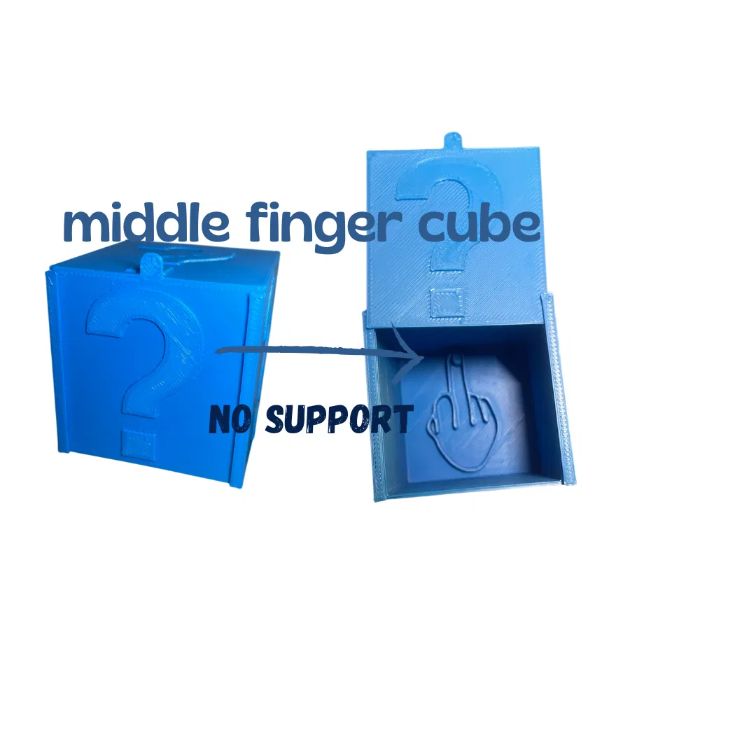 Chiếc hộp này được thiết kế tối ưu cho việc in 3D, không yêu cầu bất kỳ vật liệu hỗ trợ nào (no support), giúp quá trình in ấn diễn ra nhanh chóng và dễ dàng hơn. Bạn có thể tự tay tạo ra món quà độc đáo này bằng máy in 3D của mình. Dù là sinh nhật, lễ hội hay chỉ đơn giản là một trò đùa vui vẻ, Khối Lập Phương Ngón Giữa chắc chắn sẽ là tâm điểm của mọi cuộc vui.