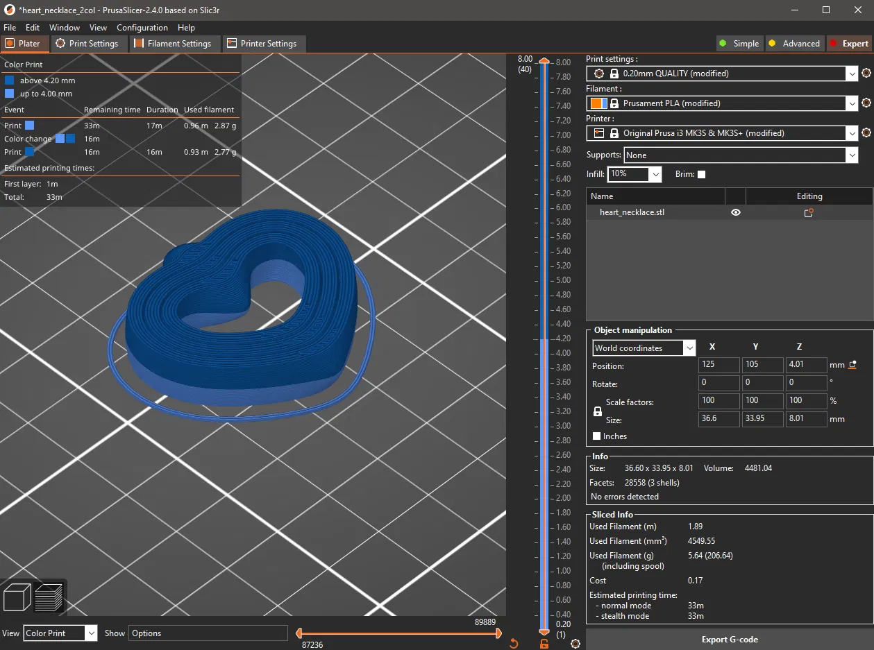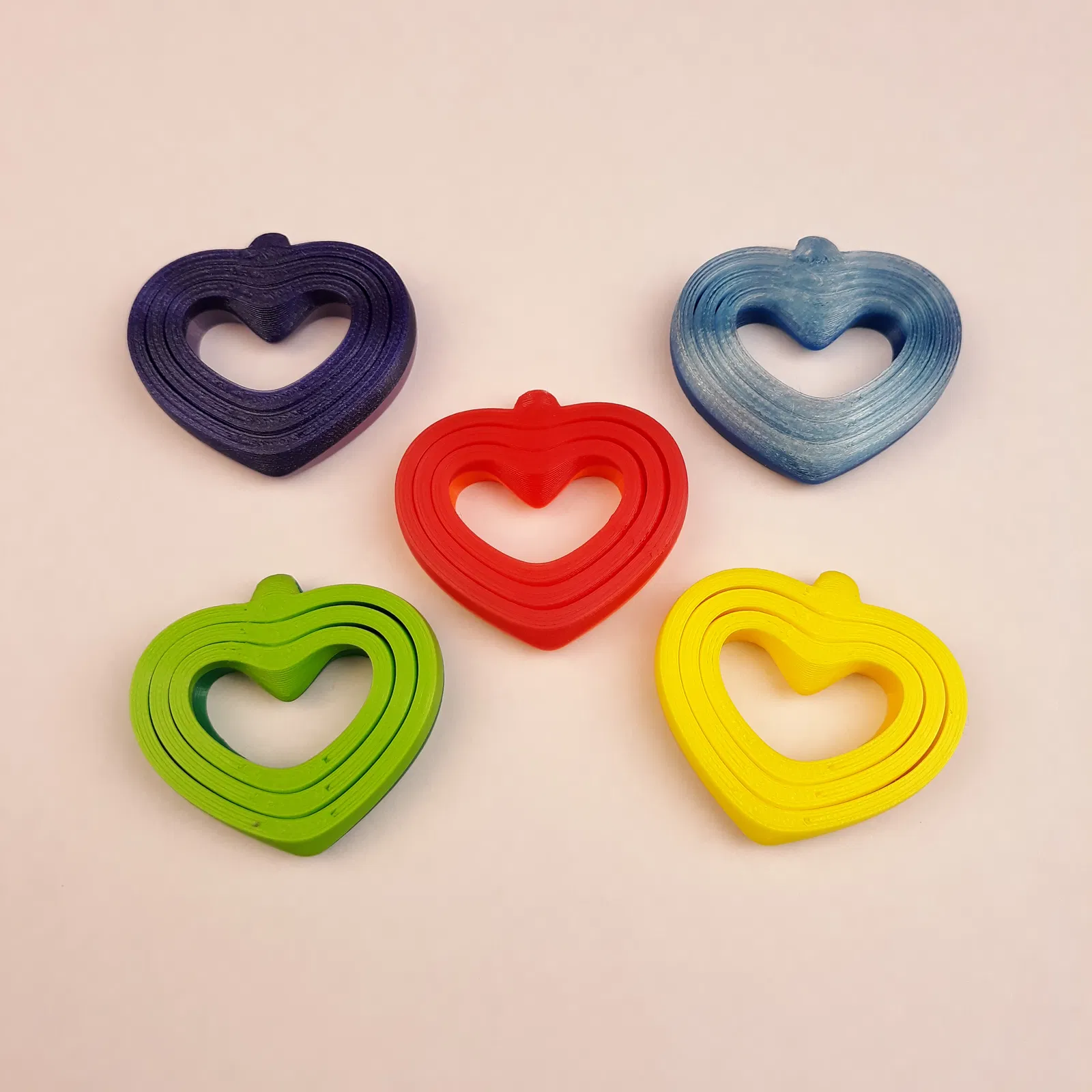 Mẫu dây chuyền trái tim xoay nhỏ gọn gồm 3 phân đoạn print-in-place có thể xoay ngay sau khi lấy khỏi heatbed. In 1 màu được, nhưng in 2 màu sẽ linh hoạt hơn: chỉ cần lật từng phân đoạn. Có eyelet để treo; kèm 2 file 3MF (0/1 lần đổi màu).