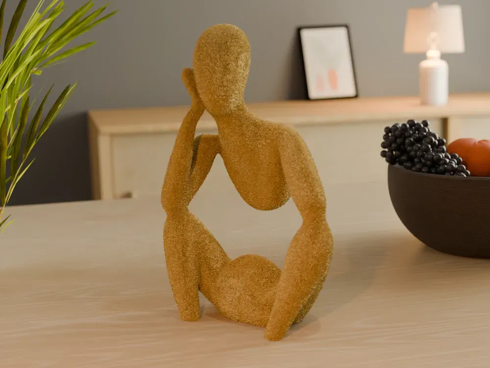 Mẫu 3D này là hình một nhân vật trong tư thế trầm tư, kết hợp giữa sự đơn giản và nét thanh lịch. Bề mặt “fuzzy” tạo cho tác phẩm vẻ ngoài độc đáo, nhìn như mềm nhẹ, vừa bắt mắt vừa gợi cảm giác thú vị về chất liệu. Với thiết kế hình học và không có chi tiết khuôn mặt cầu kỳ, bức tượng này rất hợp cho những ai mê art hiện đại và phong cách tối giản.