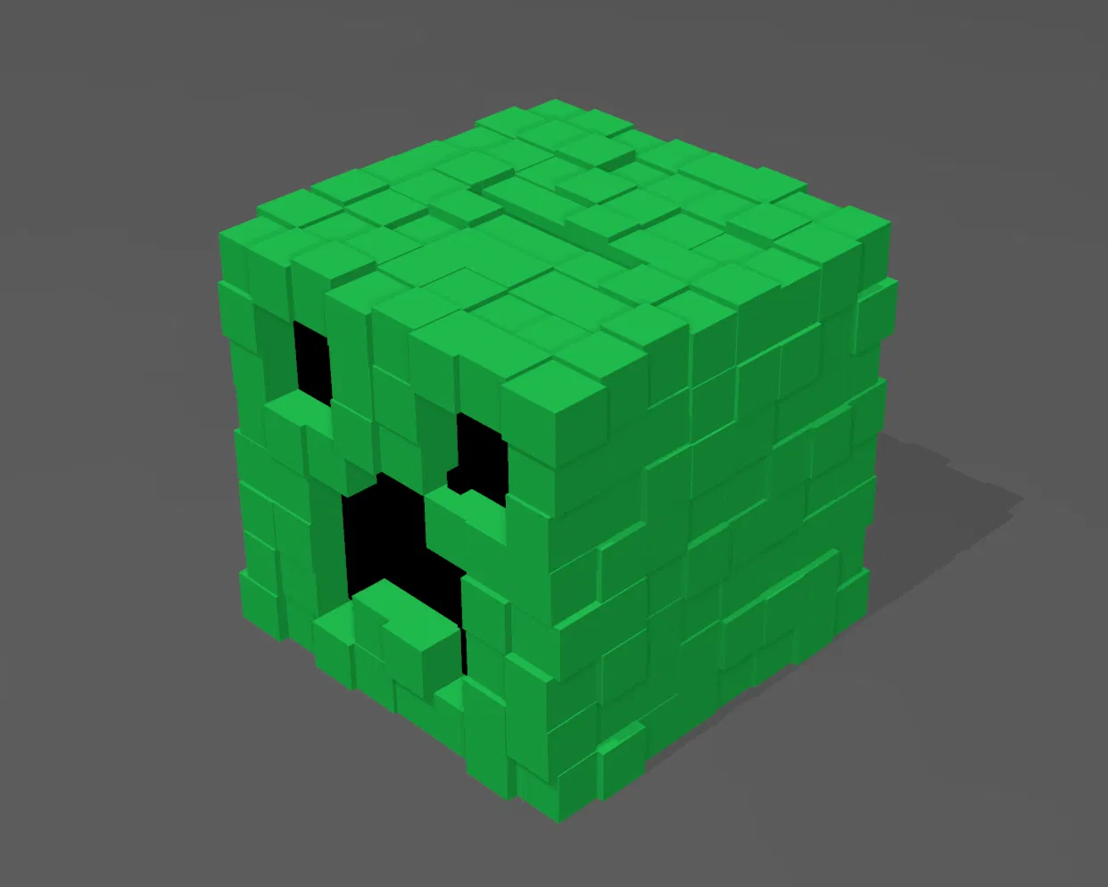 Mẫu hộp tiết kiệm hình đầu Creeper Minecraft. Khuyến nghị gắn nam châm tròn 5mm x 1mm ở phần đáy để giữ chắc hơn, và cần tạo supports khi in phần bên trong.