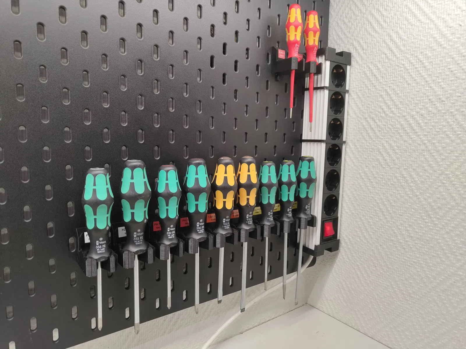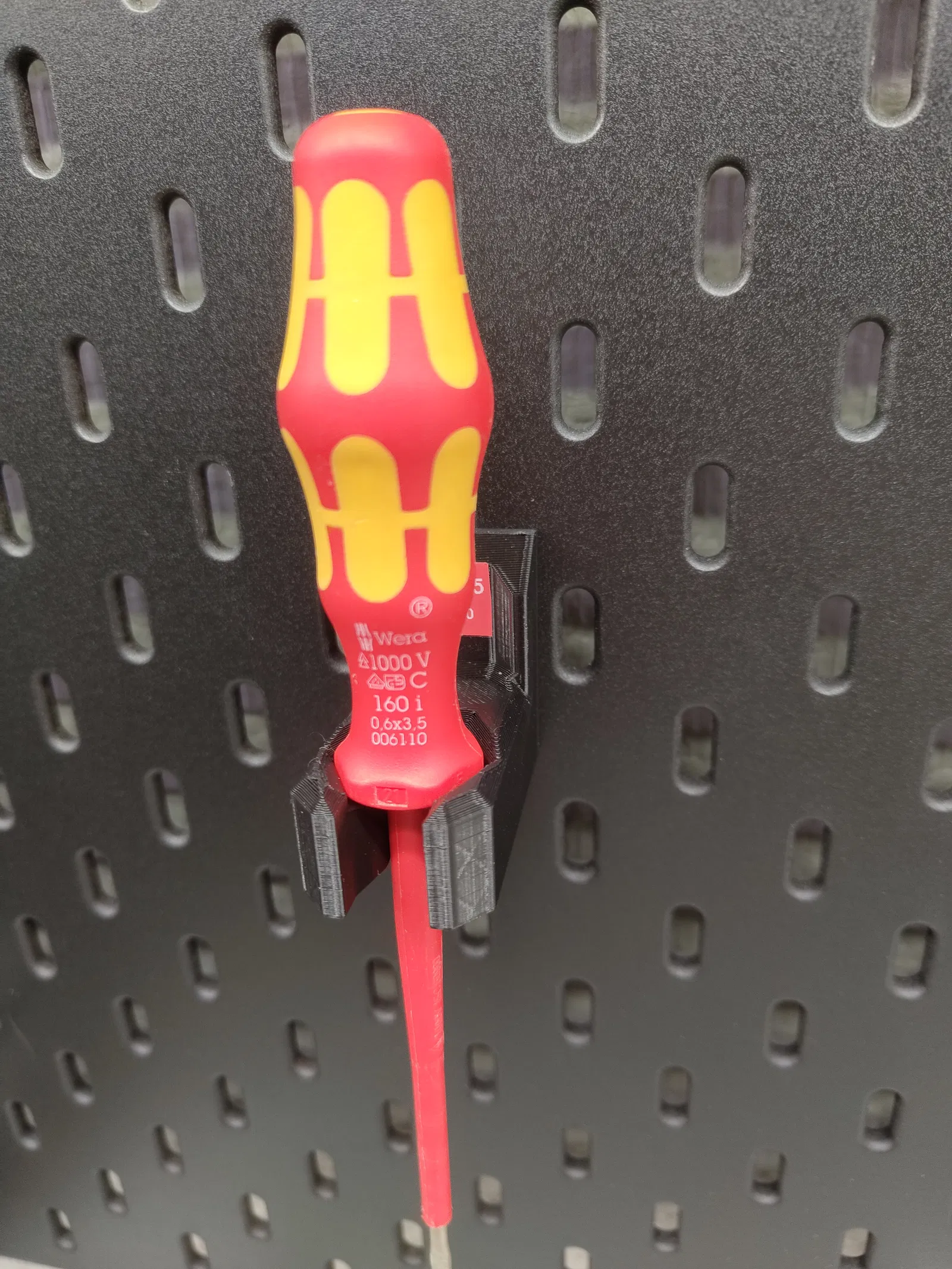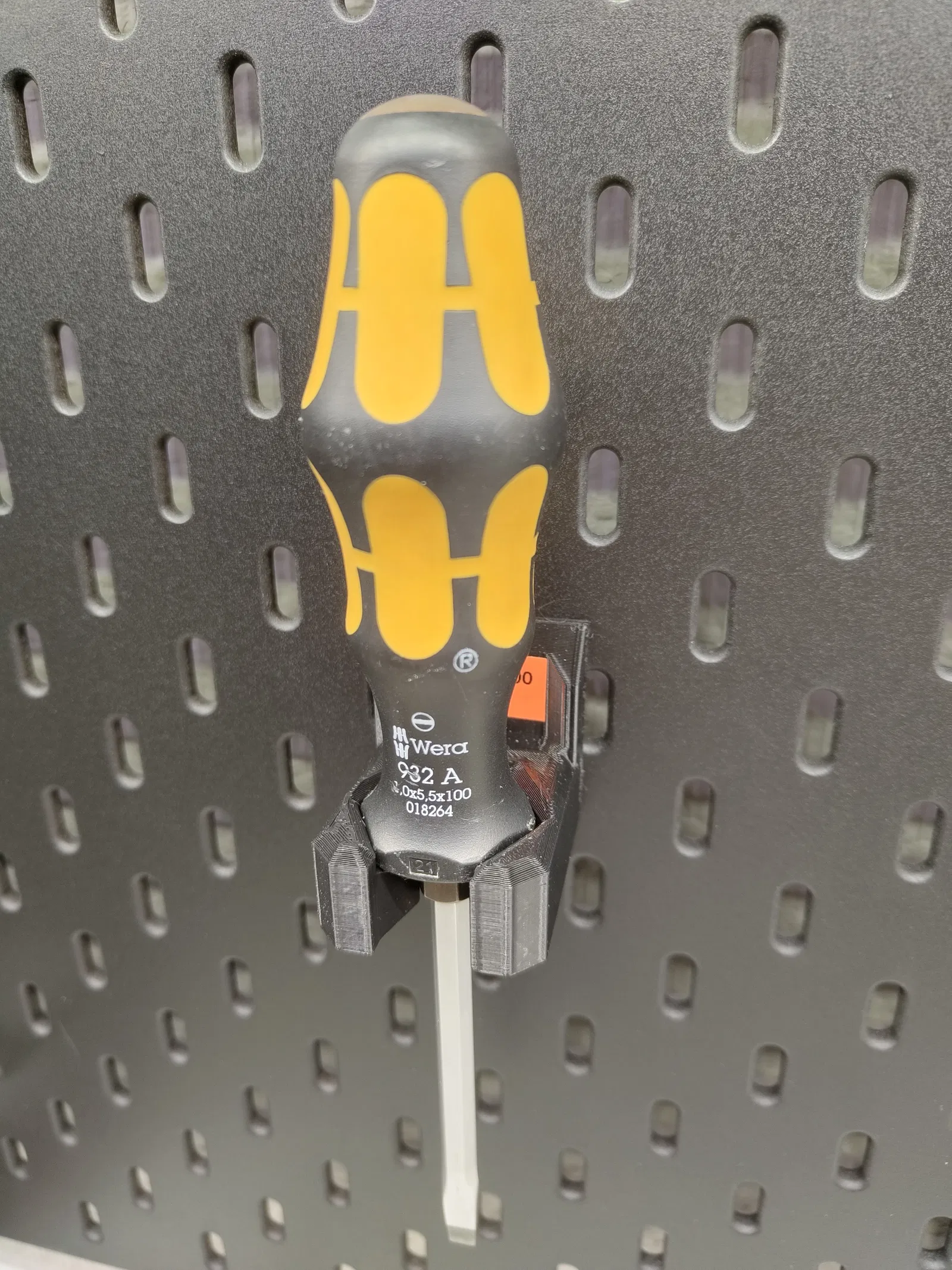 Bộ ngàm treo tua vít Wera Kraftform cho Ikea Skadis, in 2 phần không cần support. Bản remix để vừa Wera chiseldrivers 932A (cán 26,5mm) và Wera VDE 160i (cán 19,0mm); kèm file STEP đủ loại.