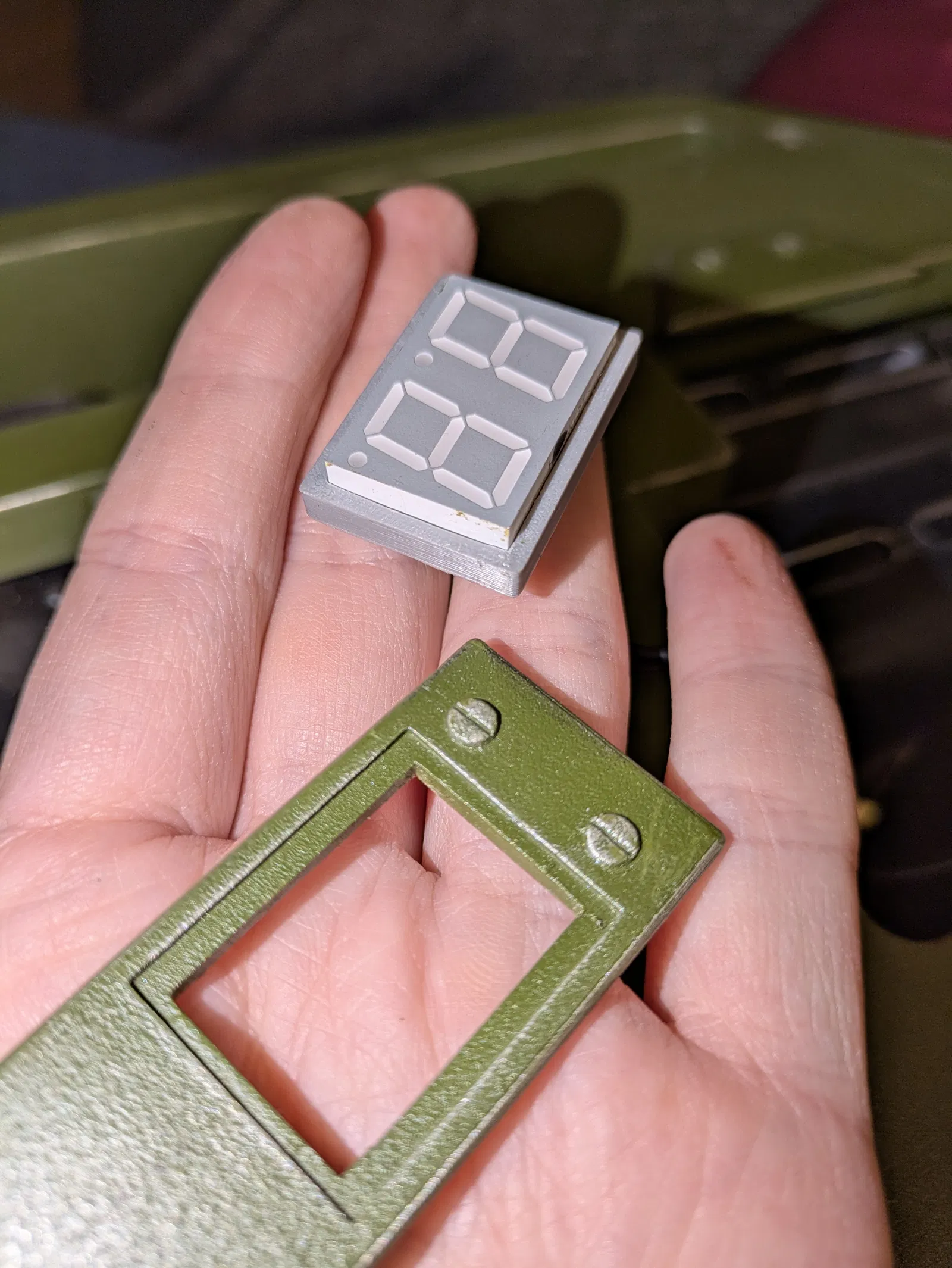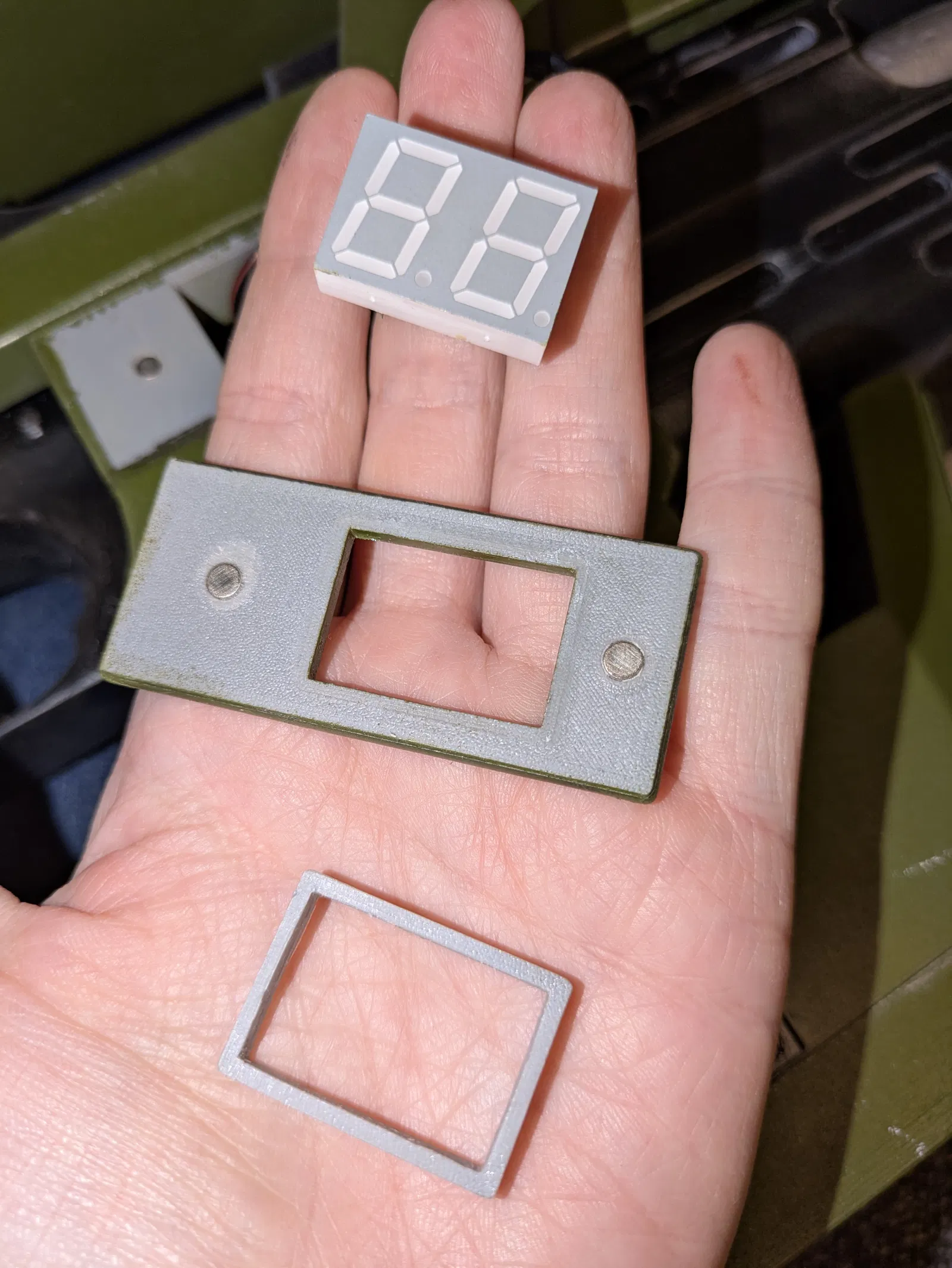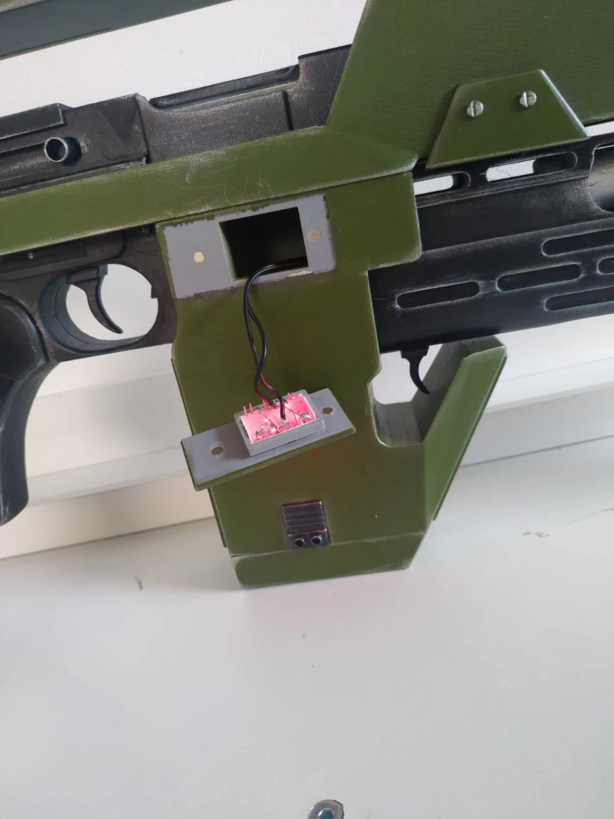 Mình đã chỉnh sửa phần khúc giữa để gắn thêm electronics. Bộ đếm đạn (ammo counter) trên pulse rifle hiện đang là màn hình hiển thị tĩnh, cấp nguồn trực tiếp để sáng lên nhưng chưa có lập trình chức năng hay tương tác gì.
