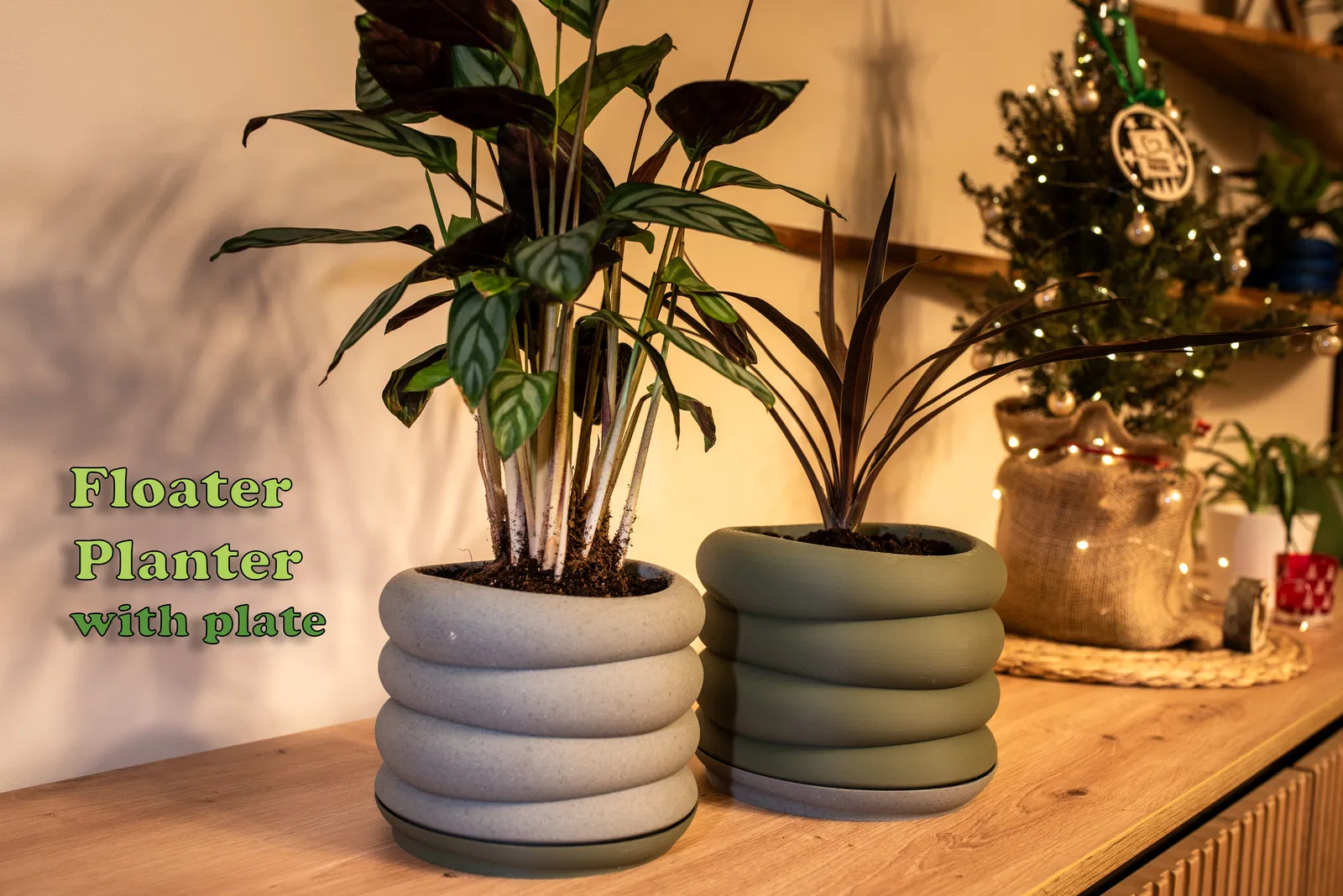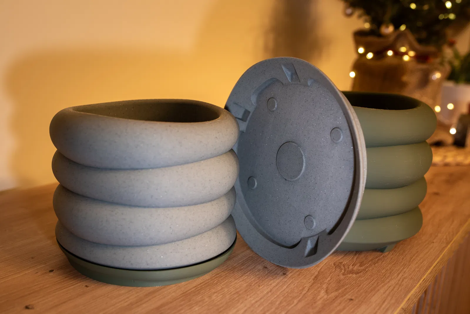Mẫu chậu trồng cây phong cách tối giản dạng các vòng torus, kèm dĩa lót. Fit cho A1 mini. Bản full size đường kính trong 120mm, cao 118mm ~1.3L; scale 90% còn ~0.9L. Gợi ý in PLA, nozzle 0.4mm.