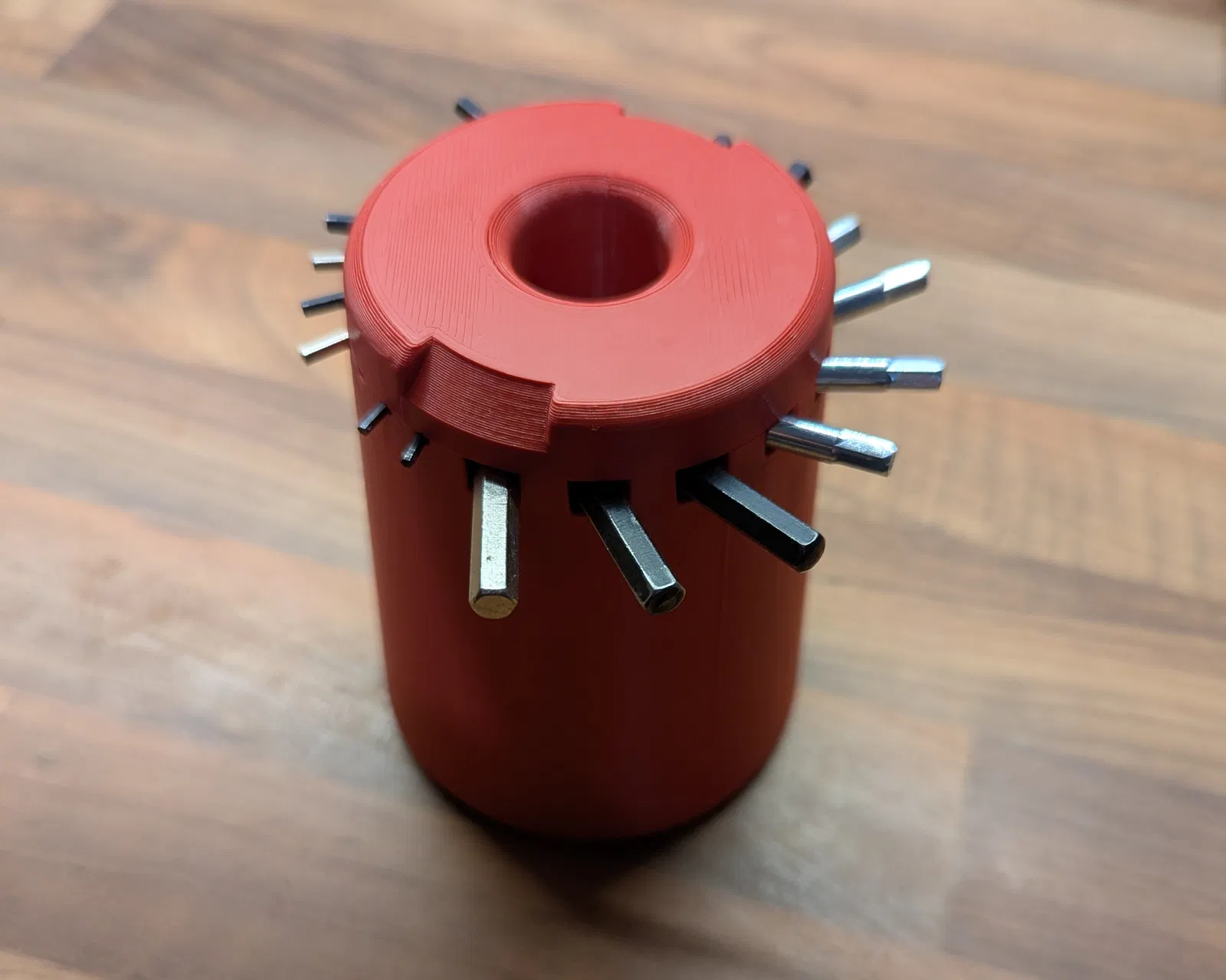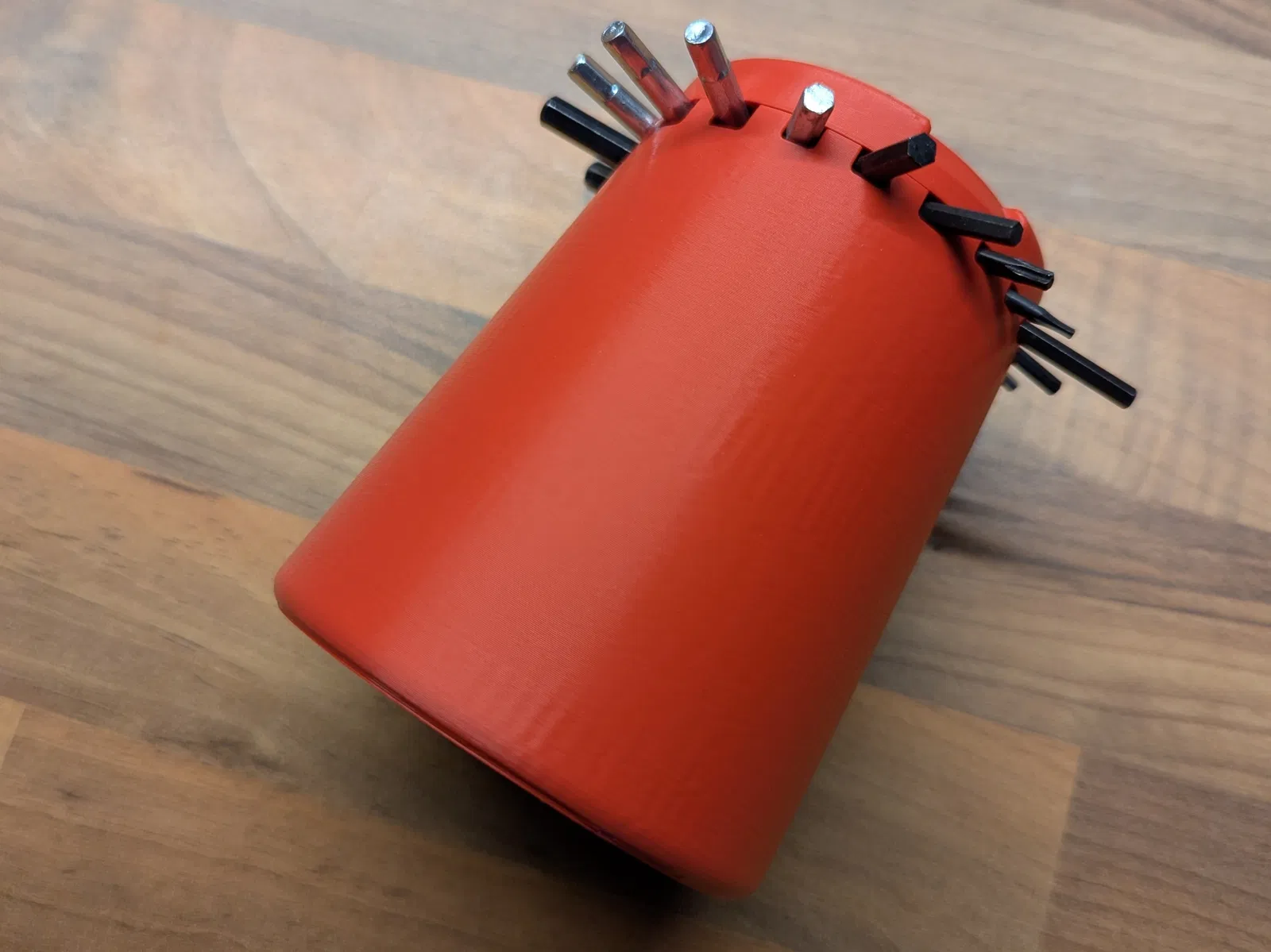 Hộp đựng lục giác nhỏ gọn cho Allen keys từ 1.5–6 mm (dài tối đa ~85 mm). Nắp liền có khóa chắc, giữ dụng cụ cố định, tránh xáo trộn. In 3D không cần support.