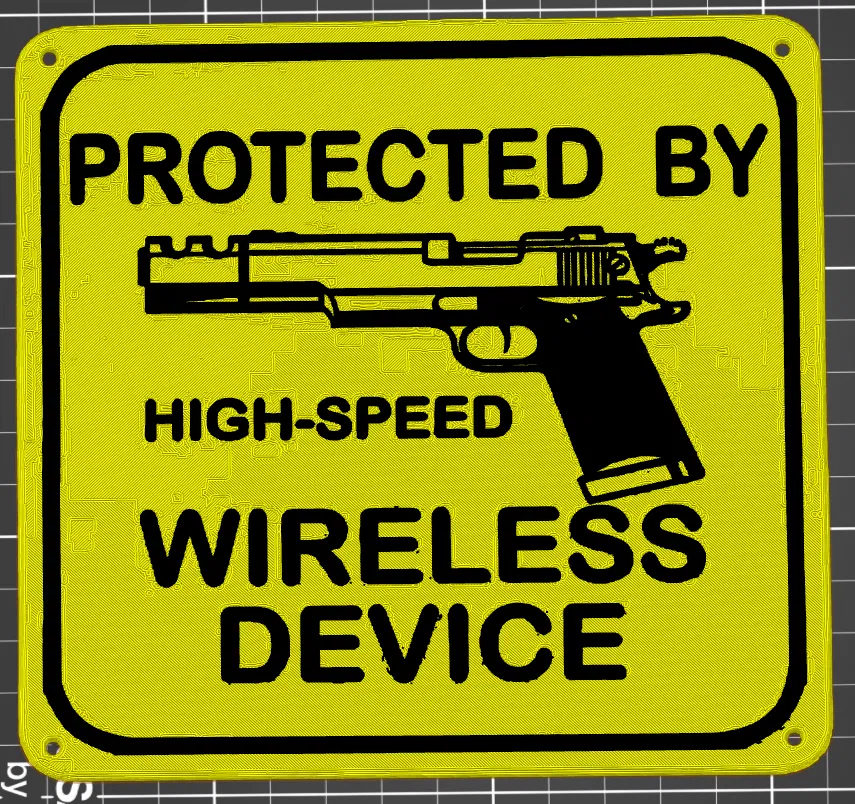 Sản phẩm in 3D "PROTECTED BY WIRELESS DEVICE PLATE" là một biển báo độc đáo, kết hợp hình ảnh khẩu súng với thông điệp hài hước về "thiết bị không dây tốc độ cao". Với kích thước 200x200 mm và khả năng in bằng PLA hoặc PTEG, biển báo này là điểm nhấn sáng tạo cho không gian làm việc hay phòng cá nhân. Dễ dàng lắp đặt với các lỗ sẵn có, sản phẩm cho phép tùy chỉnh màu sắc và có thể in hai màu. Đây là lựa chọn hoàn hảo cho những ai yêu thích công nghệ và sự độc đáo, mang lại sự hài hước tinh tế cho môi trường xung quanh.